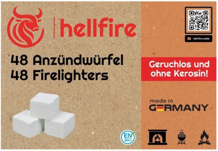 Mit den Kohlenanzündern Hellfire wird das Entzünden von Kohle, Holz oder Briketts zum Kinderspiel. Die 48 geruchlosen Würfel überzeugen durch eine besonders saubere und sichere Handhabung – ganz ohne Kerosin. Dank der DIN-geprüften Qualität und der Herstellung nach EU-Norm können Sie auf maximale Sicherheit und Effizienz vertrauen. Die Anzünder brennen langanhaltend und sind ideal für Grill, Kamin oder Feuerstelle geeignet. Hergestellt in Deutschland, garantieren die Hellfire Kohlenanzünder höchste Qualitätsstandards und Umweltfreundlichkeit. Sorgen Sie für ein schnelles und unkompliziertes Feuer – ganz ohne störende Gerüche!