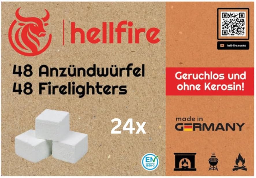 Mit den Kohlenanzündern Hellfire wird das Entzünden von Kohle, Holz oder Briketts zum Kinderspiel. Die 48 geruchlosen Würfel überzeugen durch eine besonders saubere und sichere Handhabung – ganz ohne Kerosin. Dank der DIN-geprüften Qualität und der Herstellung nach EU-Norm können Sie auf maximale Sicherheit und Effizienz vertrauen. Die Anzünder brennen langanhaltend und sind ideal für Grill, Kamin oder Feuerstelle geeignet. Hergestellt in Deutschland, garantieren die Hellfire Kohlenanzünder höchste Qualitätsstandards und Umweltfreundlichkeit. Sorgen Sie für ein schnelles und unkompliziertes Feuer – ganz ohne störende Gerüche!