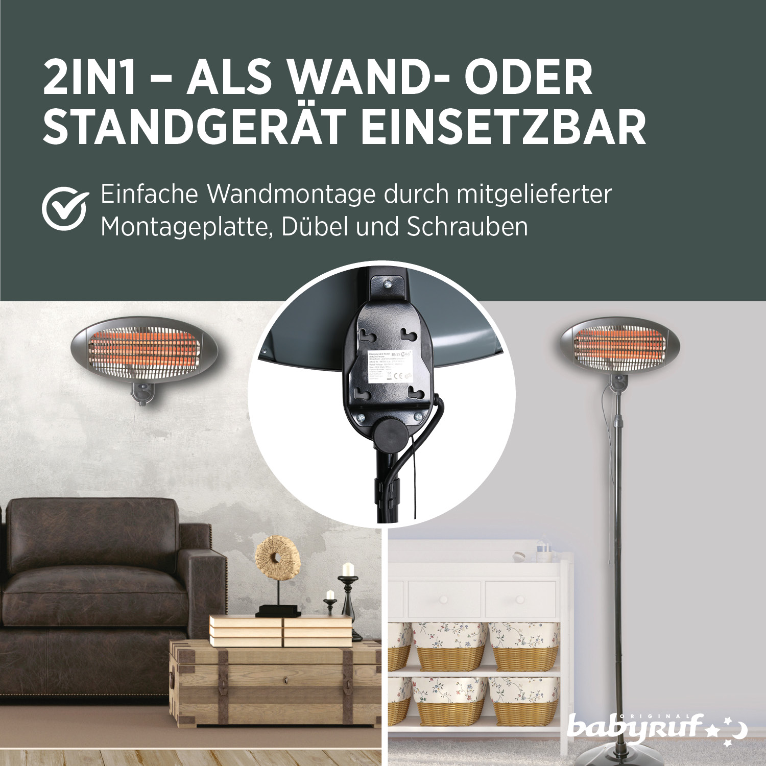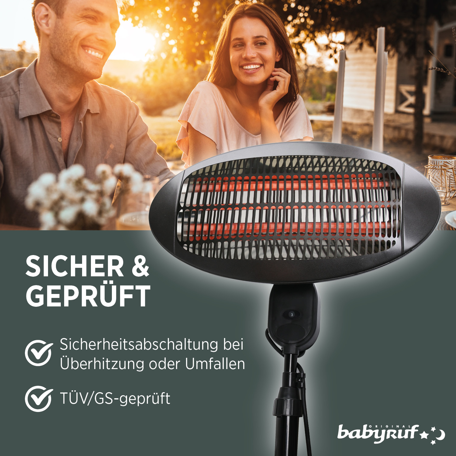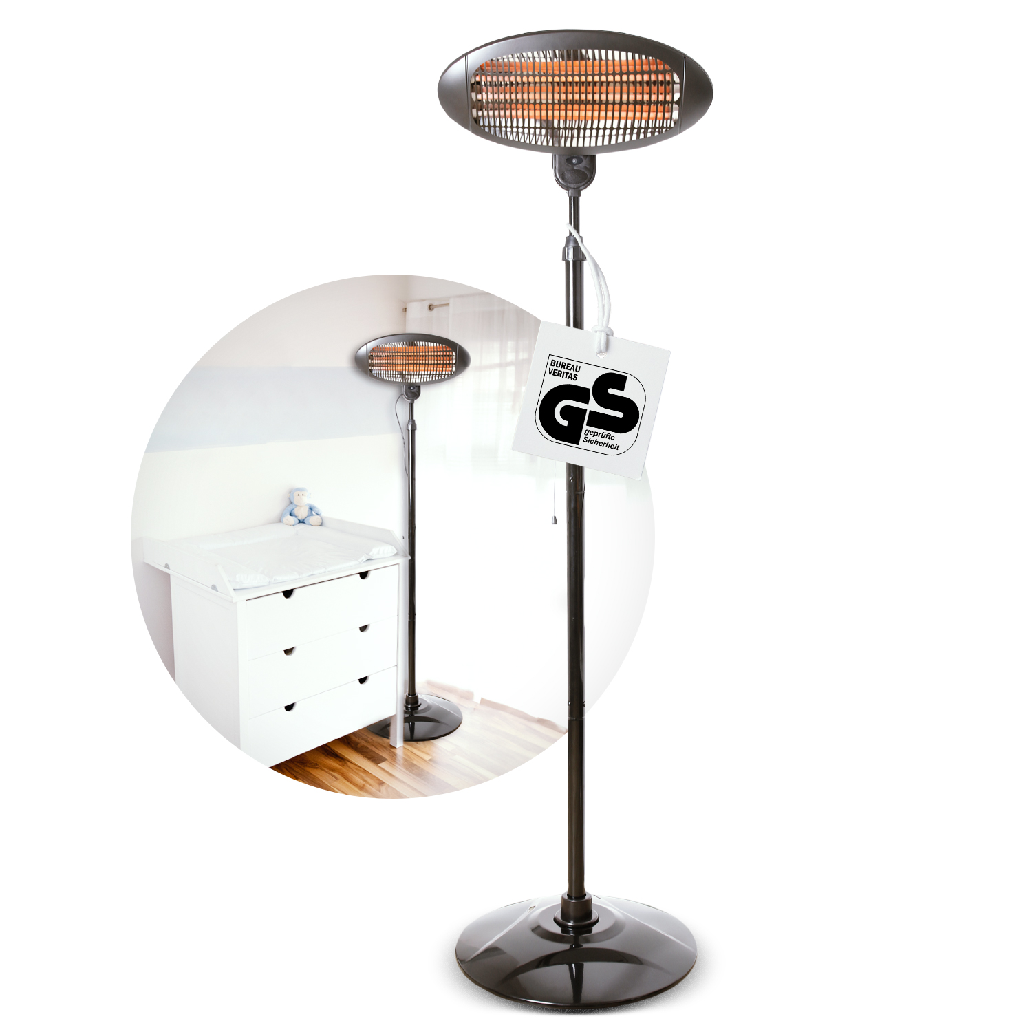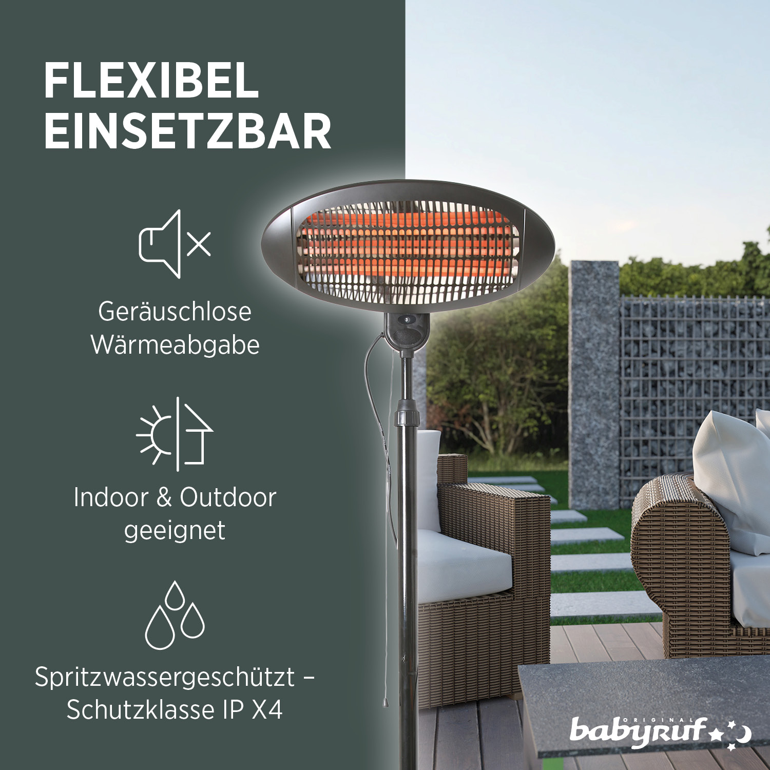 Dieser Stand-Heizstrahler mit drei Heizstäben erzeugt eine behagliche wohltuende Sofortwärme im Garten, auf der Terrasse sowie im Haus (zum Beispiel am Baby-Wickeltisch oder im Hobbykeller). Ein Sicherheitsgeflecht über den Heizstäben bietet Schutz vor Absplitterungen.