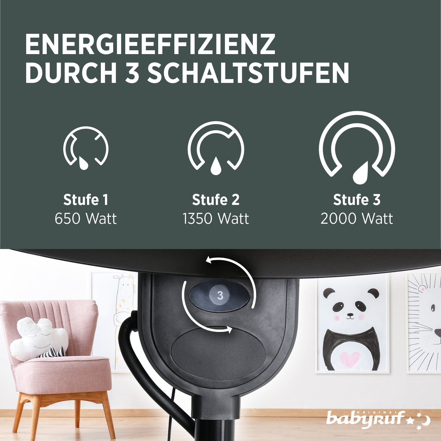 Die Wärmeentwicklung ist regulierbar über drei Heizstufen: