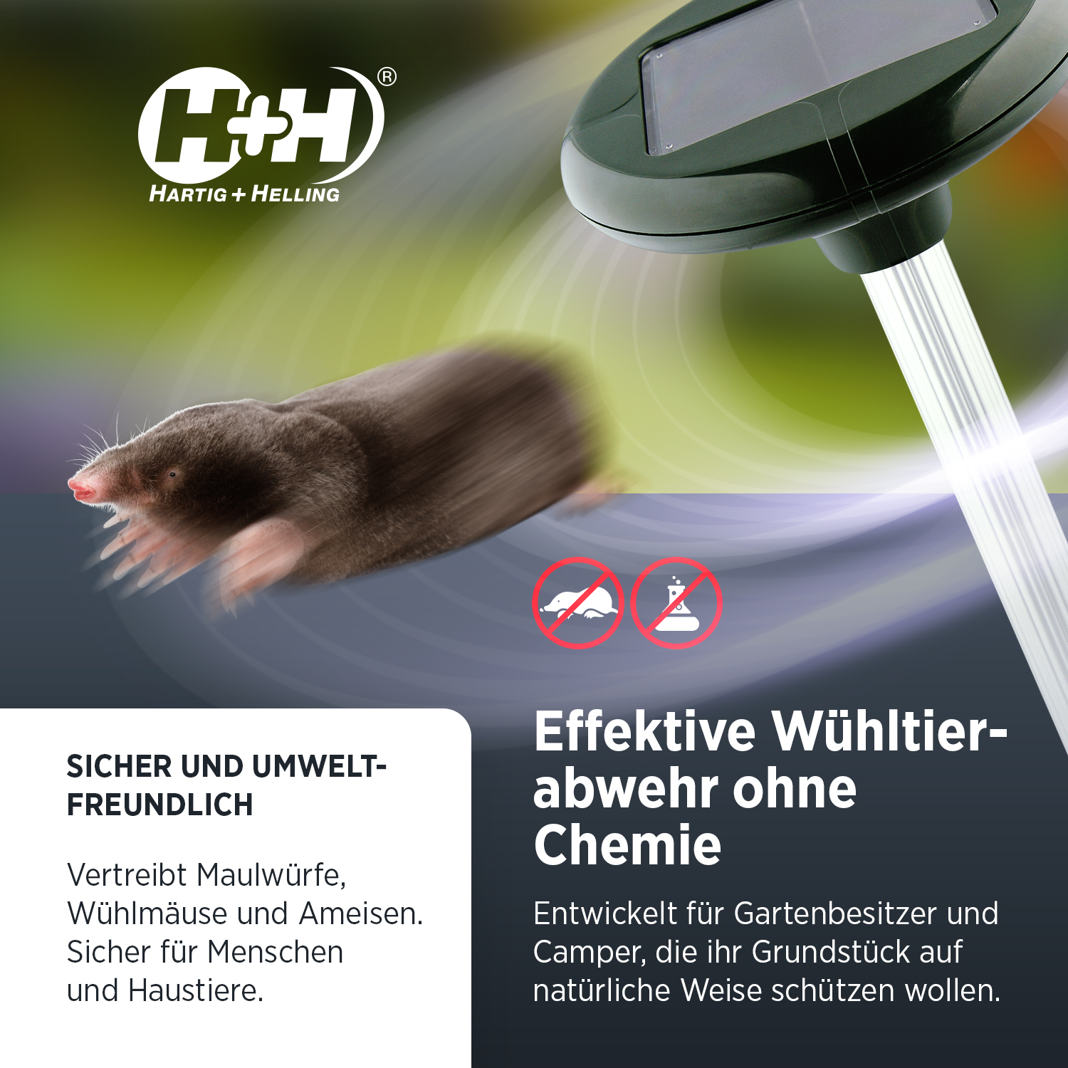Die H+H Solar Maulwurfschrecke sind leistungsstarke und umweltfreundliche Geräte, die eine Fluchtreaktion bei Nagetieren wie Maulwürfen, Wühlmäusen oder Spitzmäusen hervorrufen können. Hier sind einige der wichtigsten Eigenschaften: