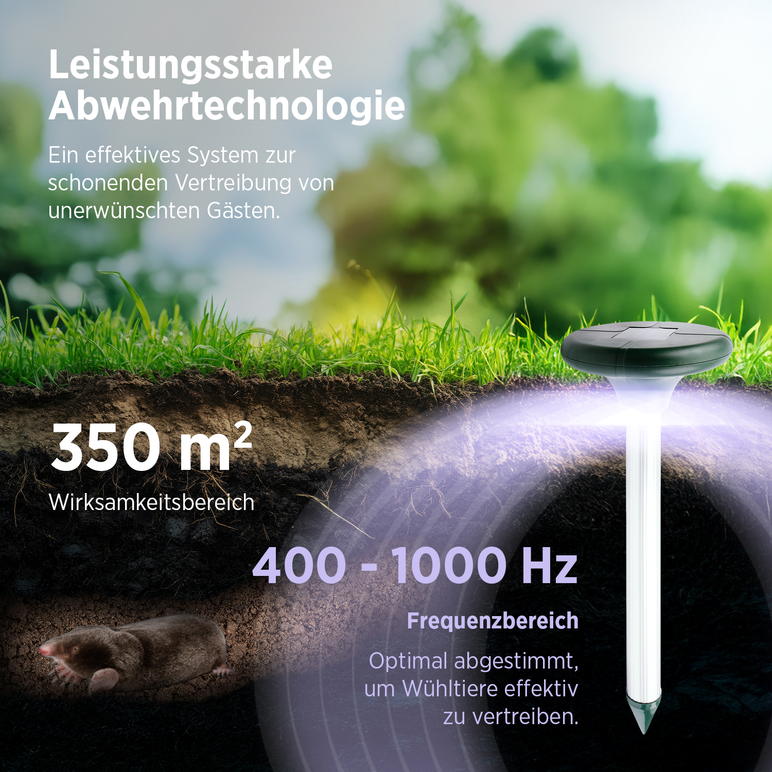 - Der Maulwurfschreck erzeugt Schallwellen mit einer Frequenz von 400-1000 Hz, die für Nagetiere unangenehm sind und sie dazu bringen, das Gebiet zu verlassen.