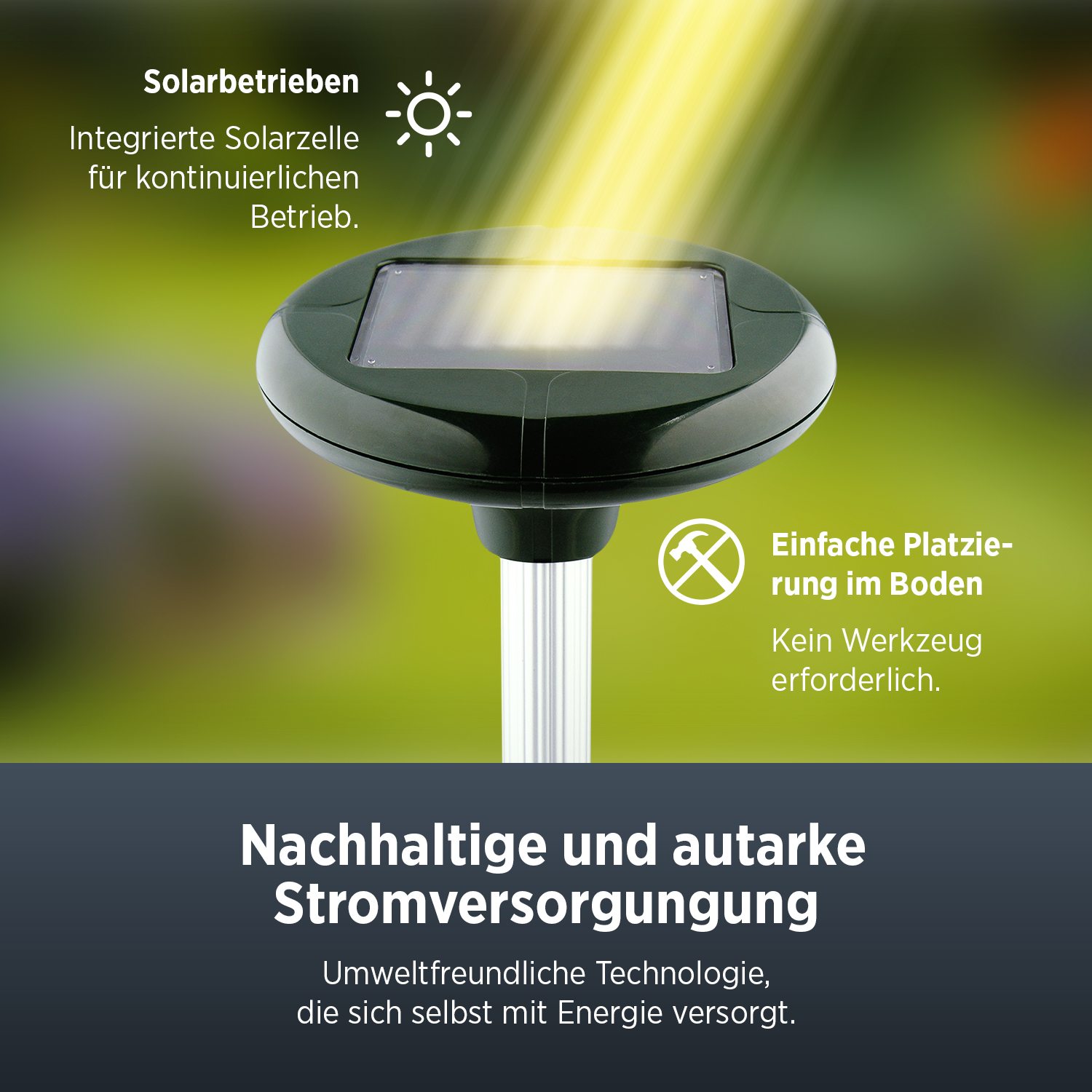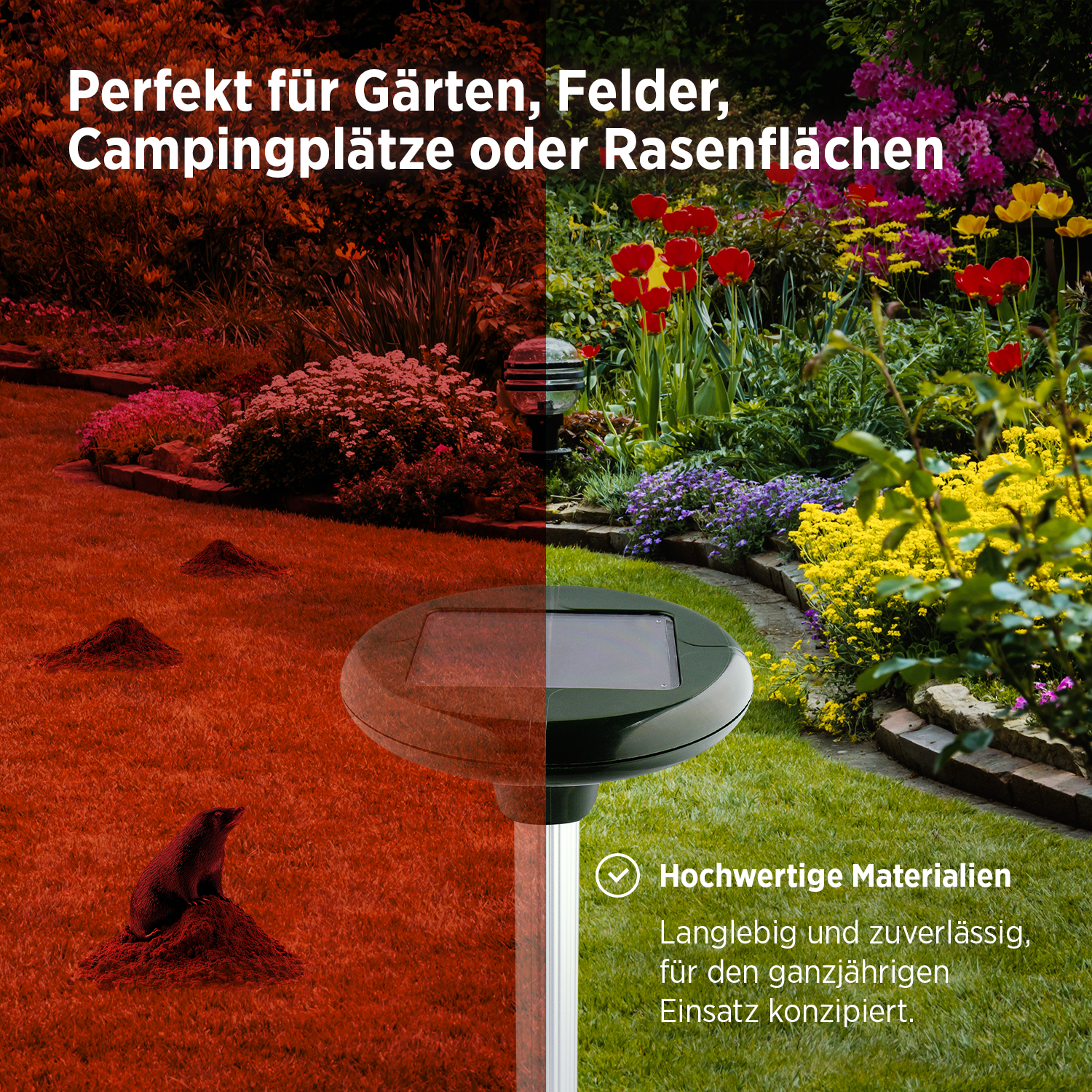 - Der Maulwurfschreck wird von Solarzellen betrieben, was ihn sehr energieeffizient und umweltfreundlich macht. Der integrierte Akku wird durch die Sonnenenergie aufgeladen und ermöglicht eine ununterbrochene Nutzung.
