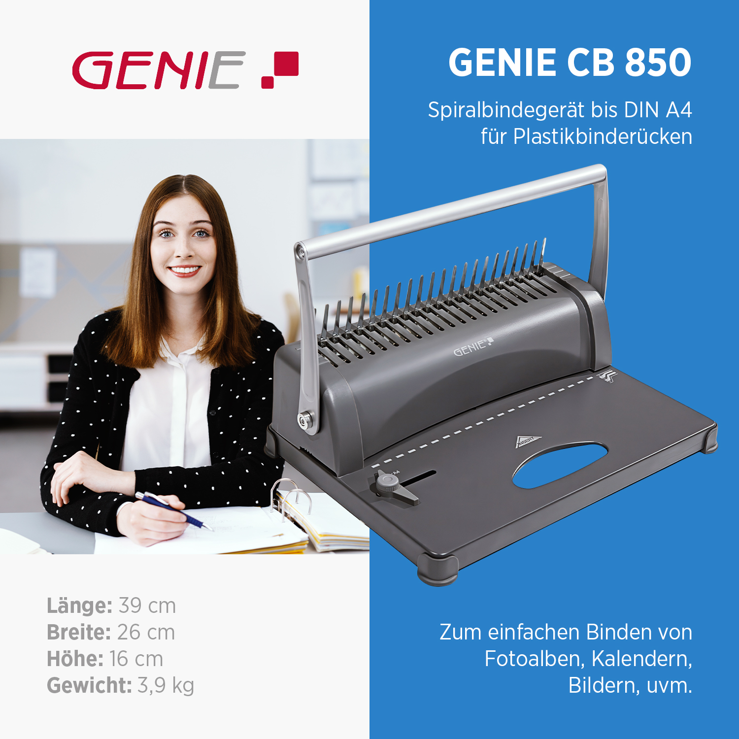 Das GENIE CB850 Bindegerät ist eine hochwertige Bindemaschine, die sich ideal für das Binden von Fotoalben, Kalendern oder Bildern eignet. Hier sind einige wichtige Eigenschaften und Funktionen des Bindegeräts: