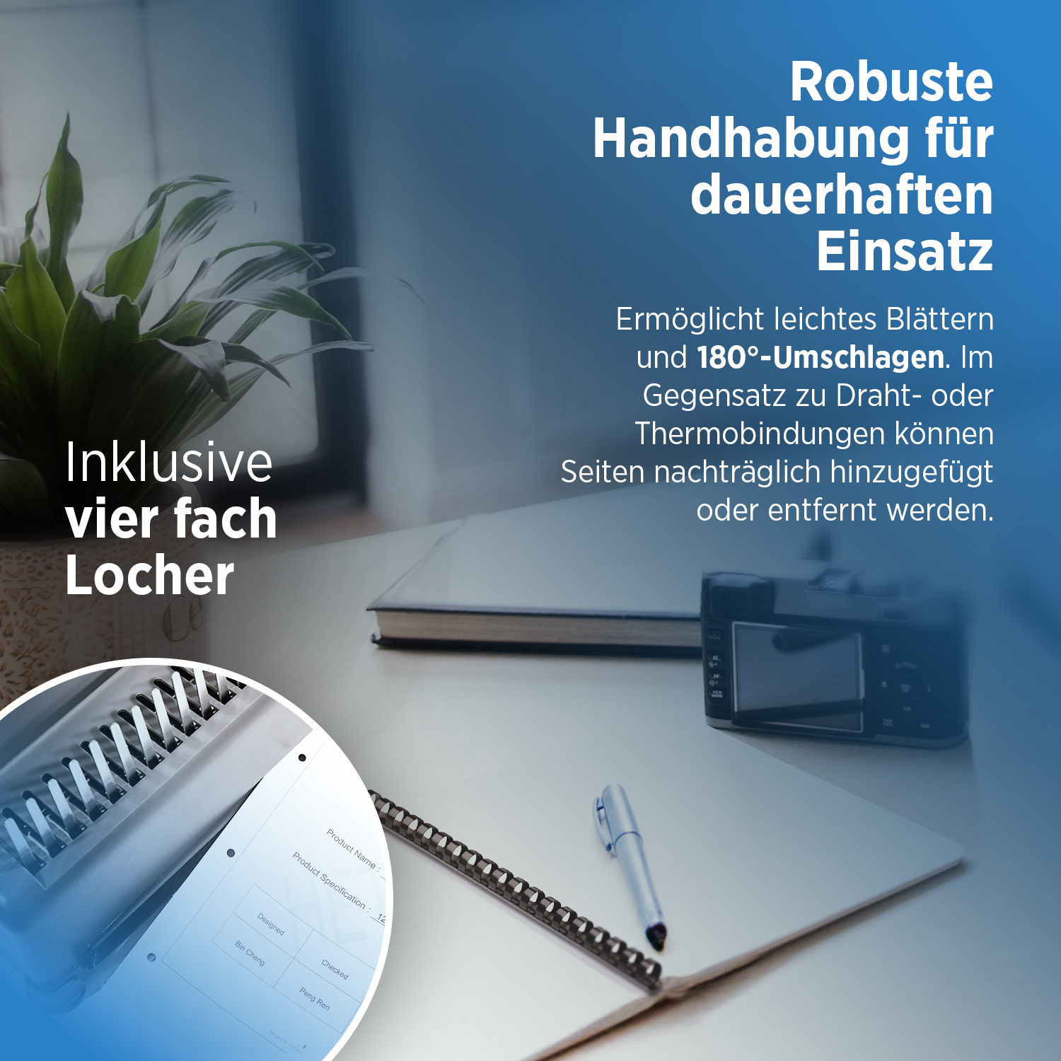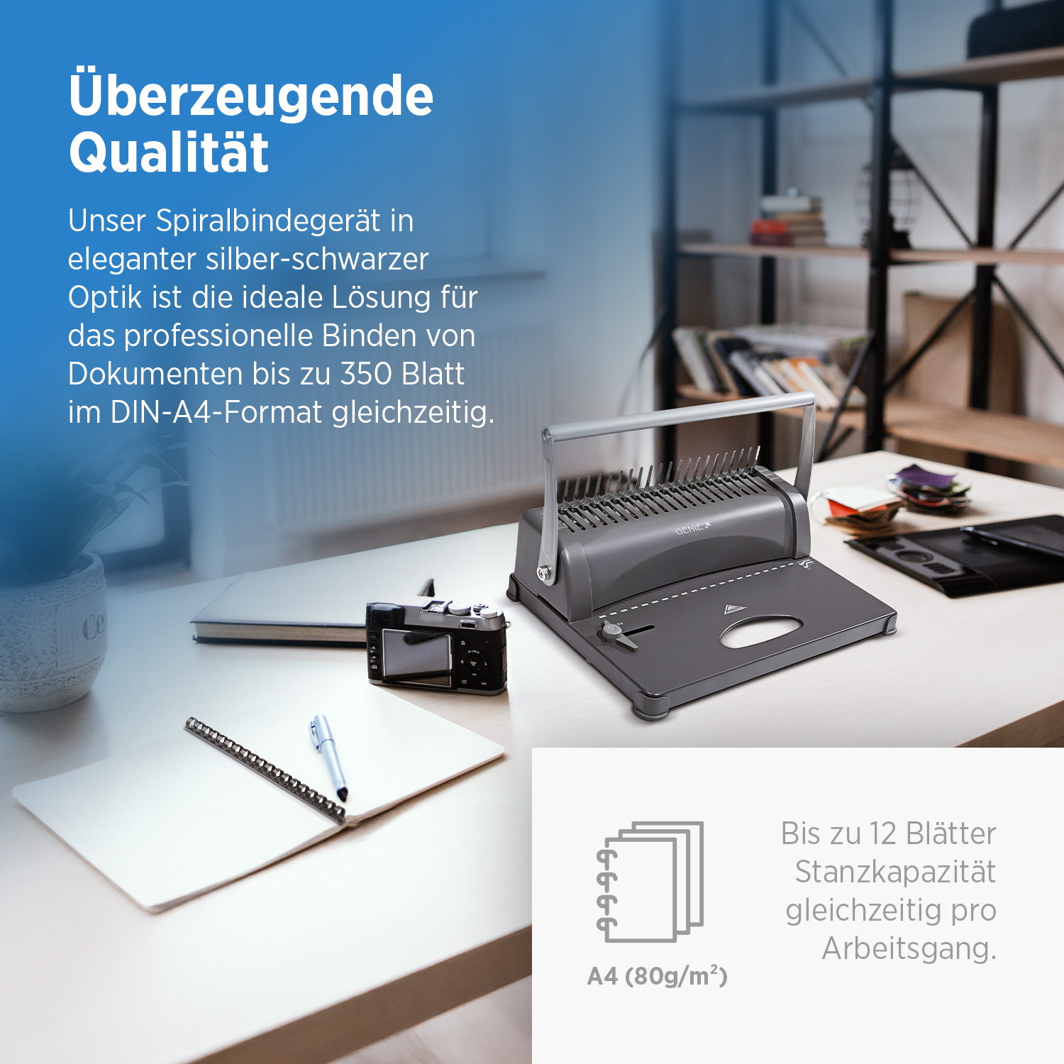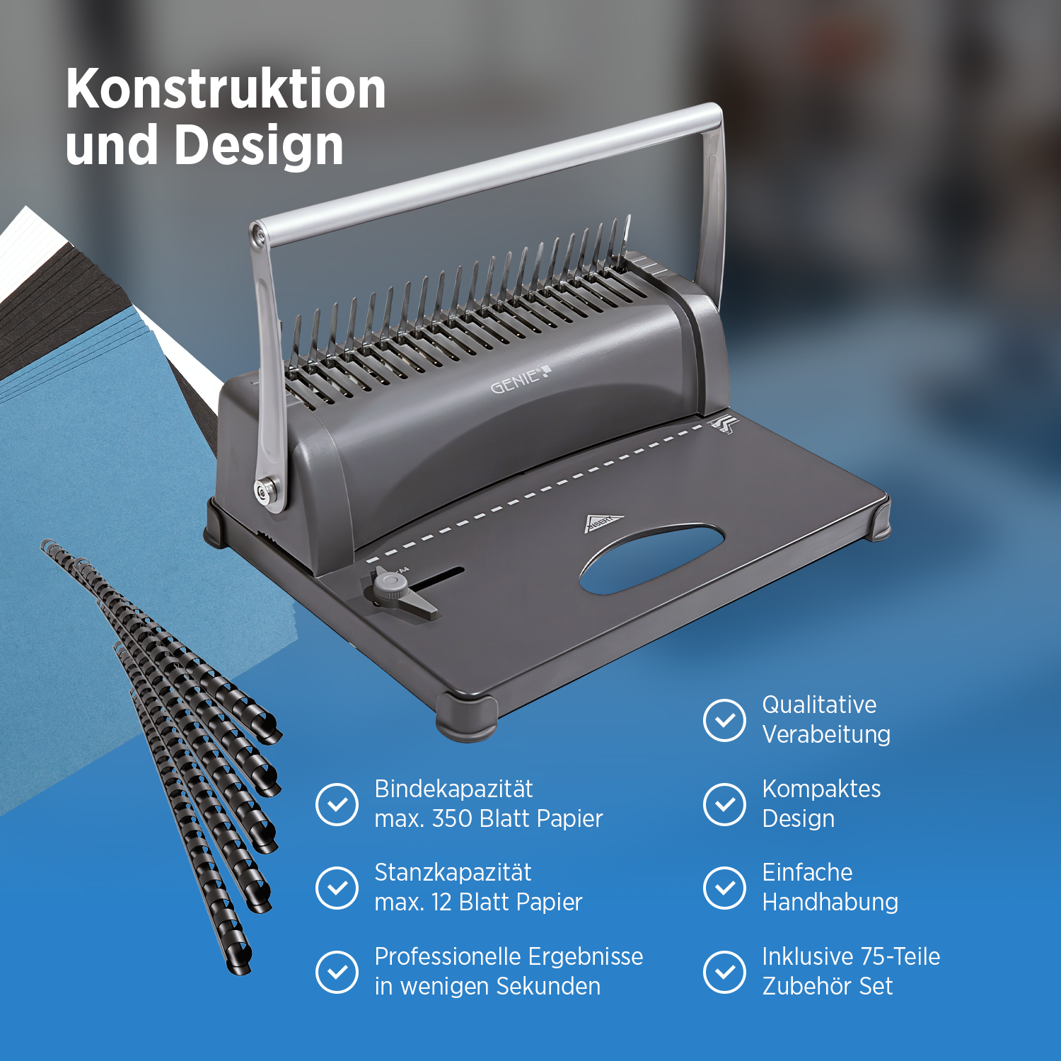 - Die maximale Bindekapazität beträgt 350 Blatt Papier (80g/m²), was ausreichend Platz für umfangreiche Projekte bietet.