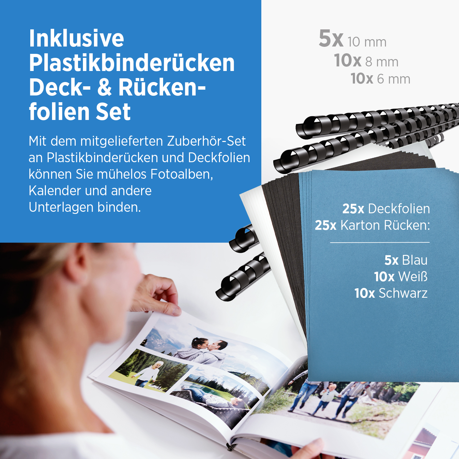Das Starter-Set ist sehr praktisch und bietet eine gute Auswahl an verschiedenen Binderrücken und Rückenkartons in verschiedenen Farben. Mit dem 4-Fach Locher können Sie schnell und einfach Löcher in Ihr Papier stanzen, so dass Sie es mit dem Bindegerät binden können.
