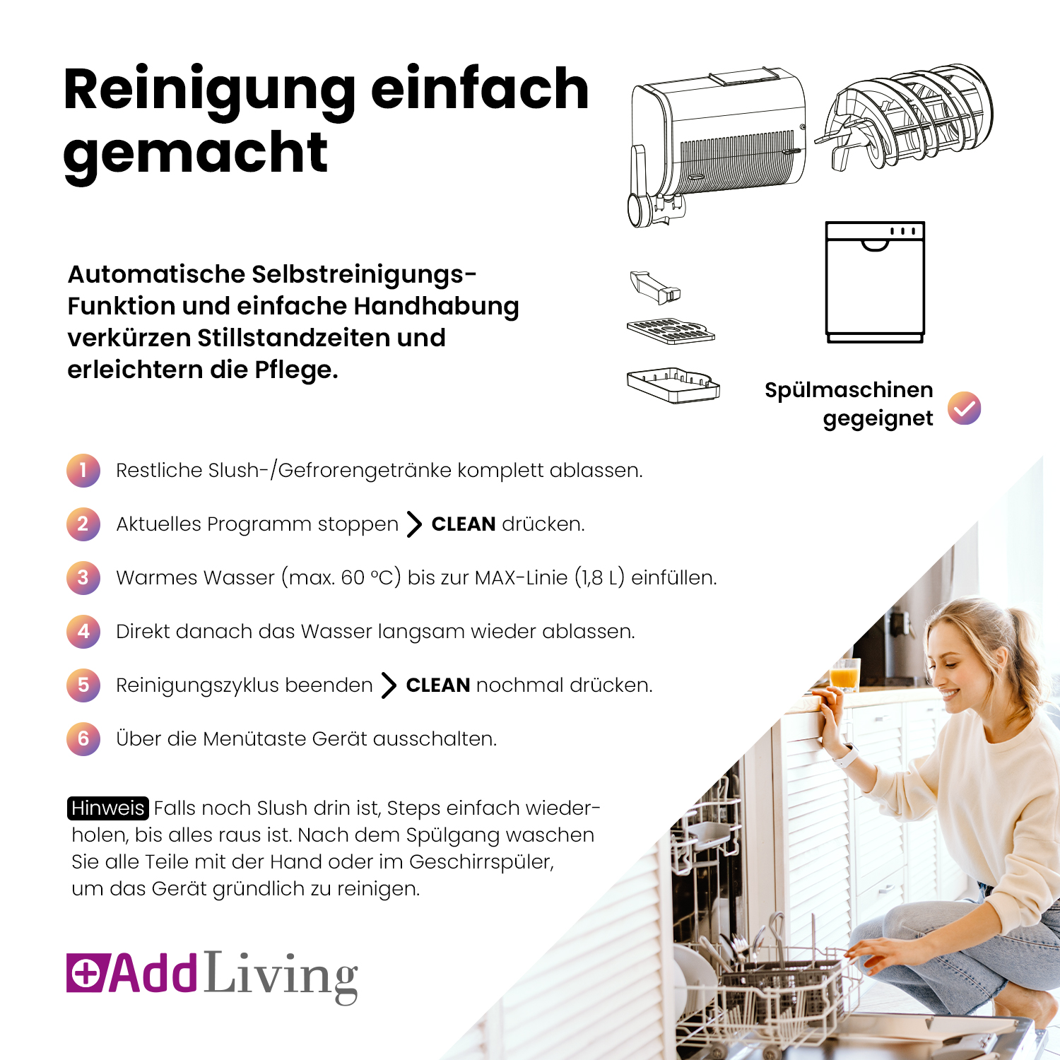 Dank der 6 voreingestellten Programme gelingt die Zubereitung kinderleicht: Einfach Getränk einfüllen, Programm wählen und genießen. Innerhalb von ca. 30 Minuten wird aus Flüssigkeit ein erfrischender Slush – und das Getränk bleibt auf Wunsch bis zu 12 Stunden gefroren.