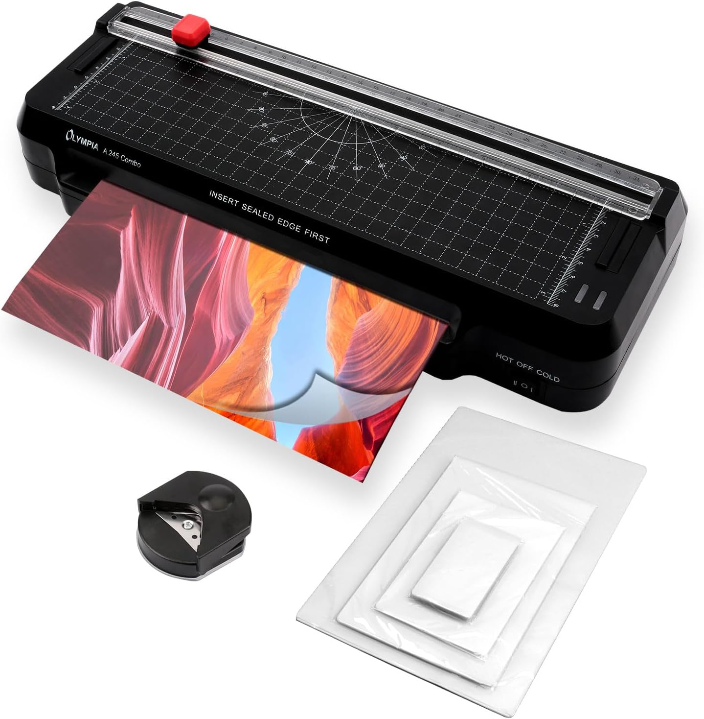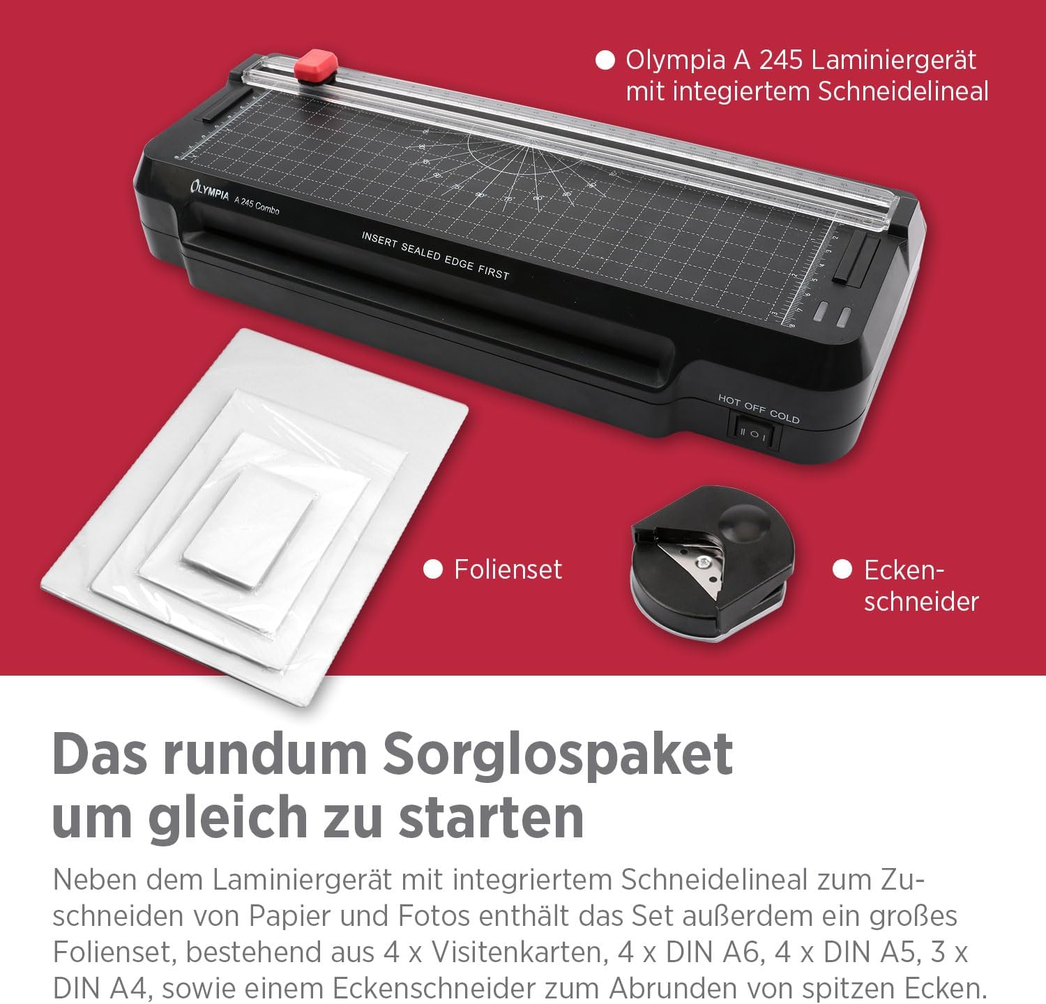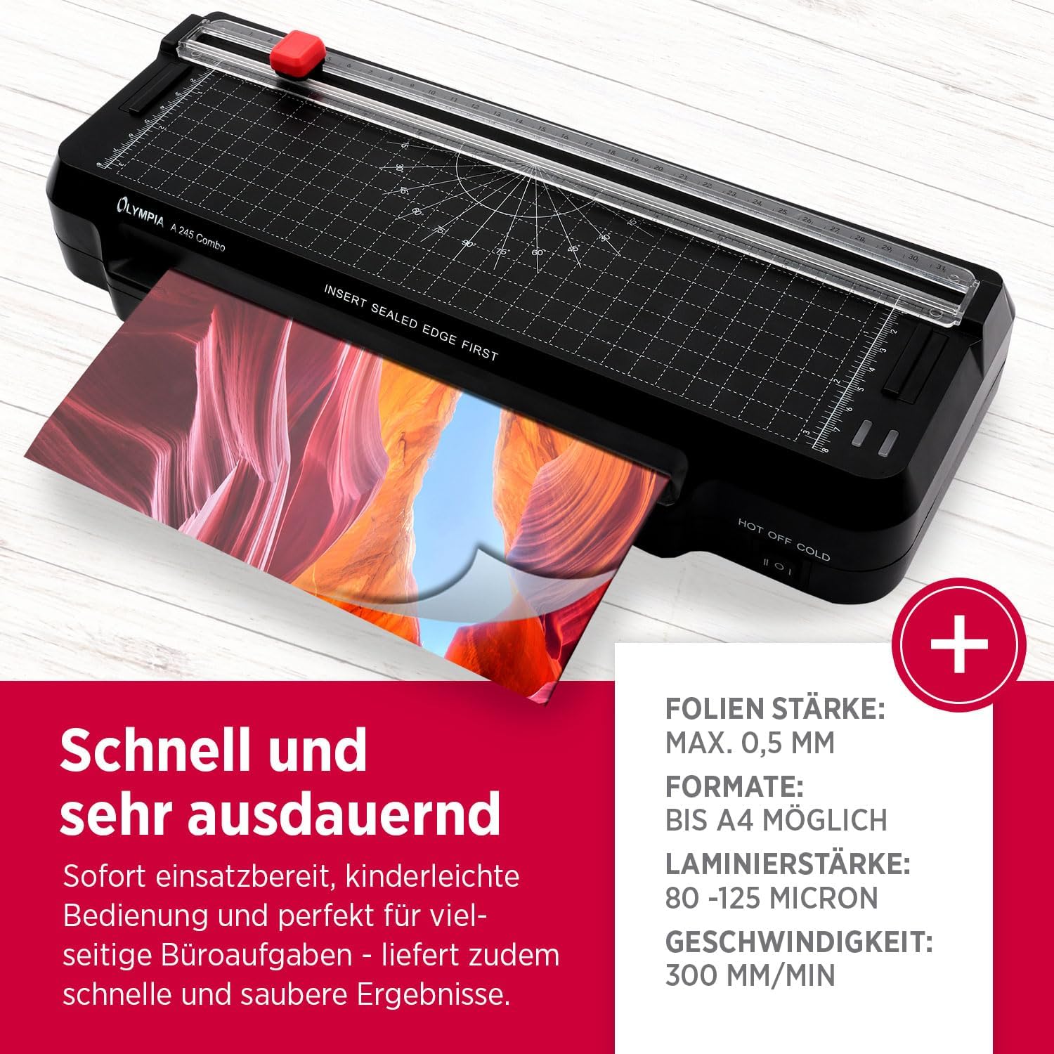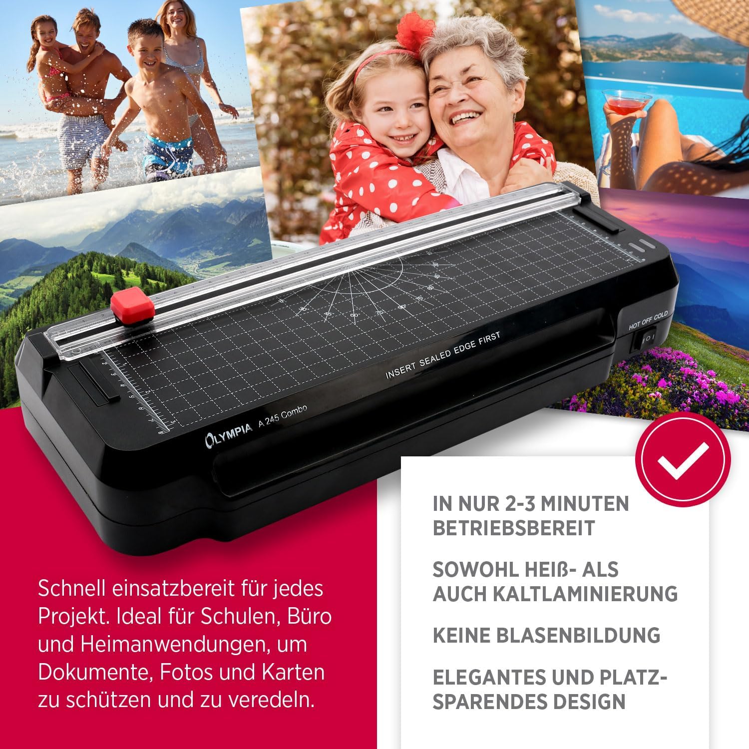 Mit dem Olympia A 245 Combo 4 in 1 Laminiergerät erhalten Sie ein vielseitiges, leistungsstarkes und benutzerfreundliches Gerät, das Ihre Dokumente professionell und ansprechend präsentiert. Es ist die ideale Wahl für Büros, Schulen, zu Hause oder überall dort, wo eine zuverlässige Laminierlösung benötigt wird.