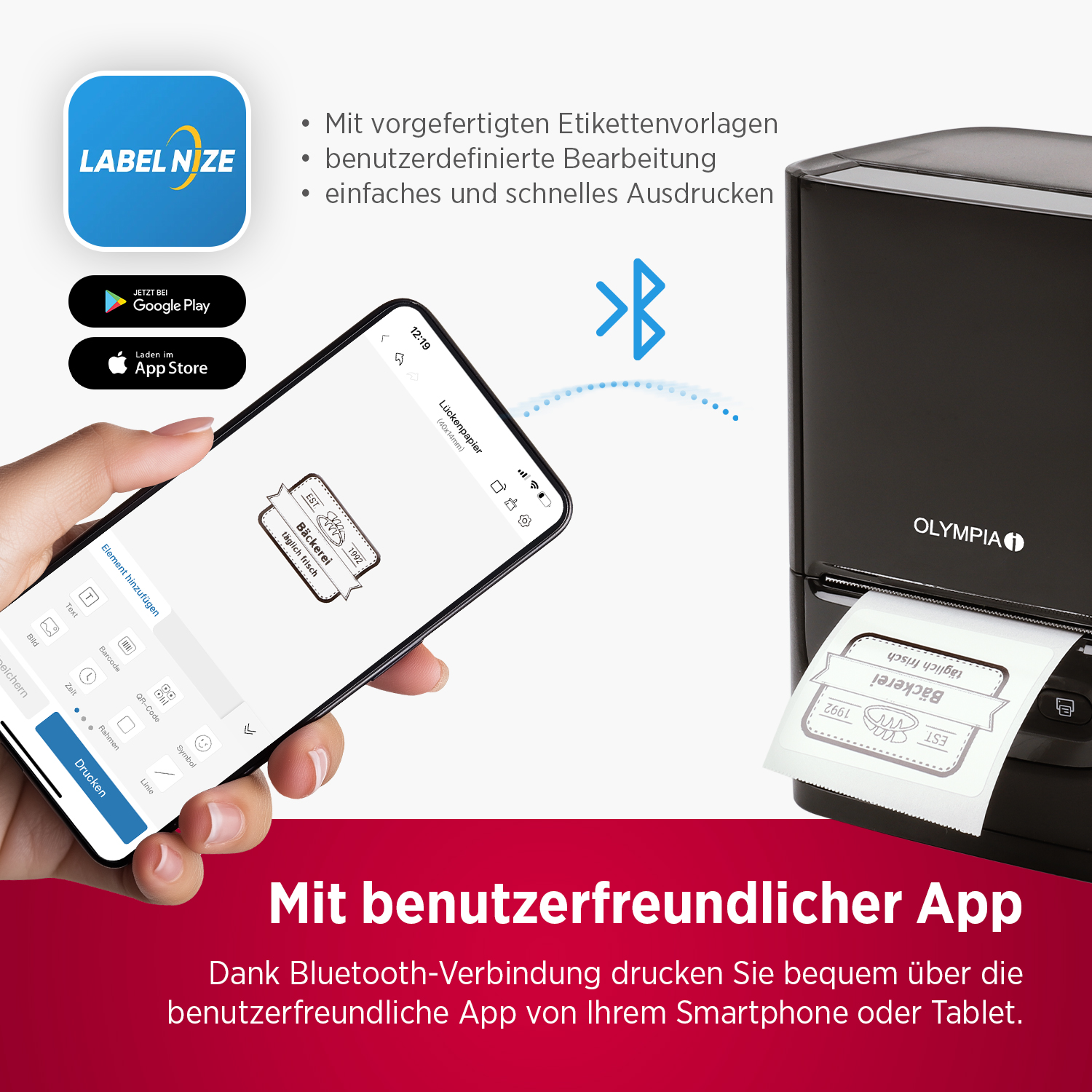 Einfach per Bluetooth mit deinem Smartphone oder Tablet verbinden – die benutzerfreundliche App ermöglicht dir kreative Gestaltungen mit Texten, Symbolen, QR-Codes oder Barcodes. Ideal für Ordnungssysteme, Vorratsdosen, Kabel, Akten, DIY & mehr!