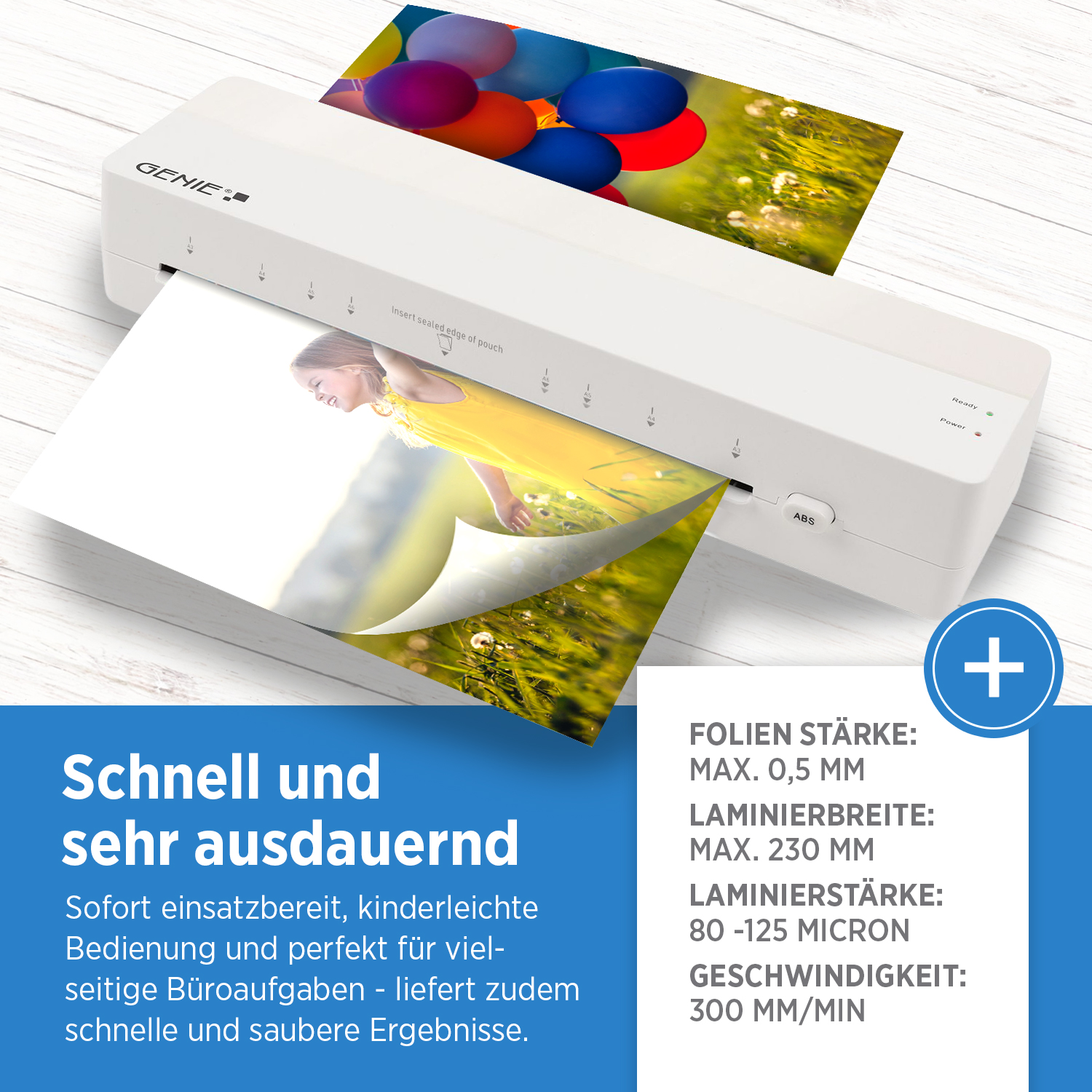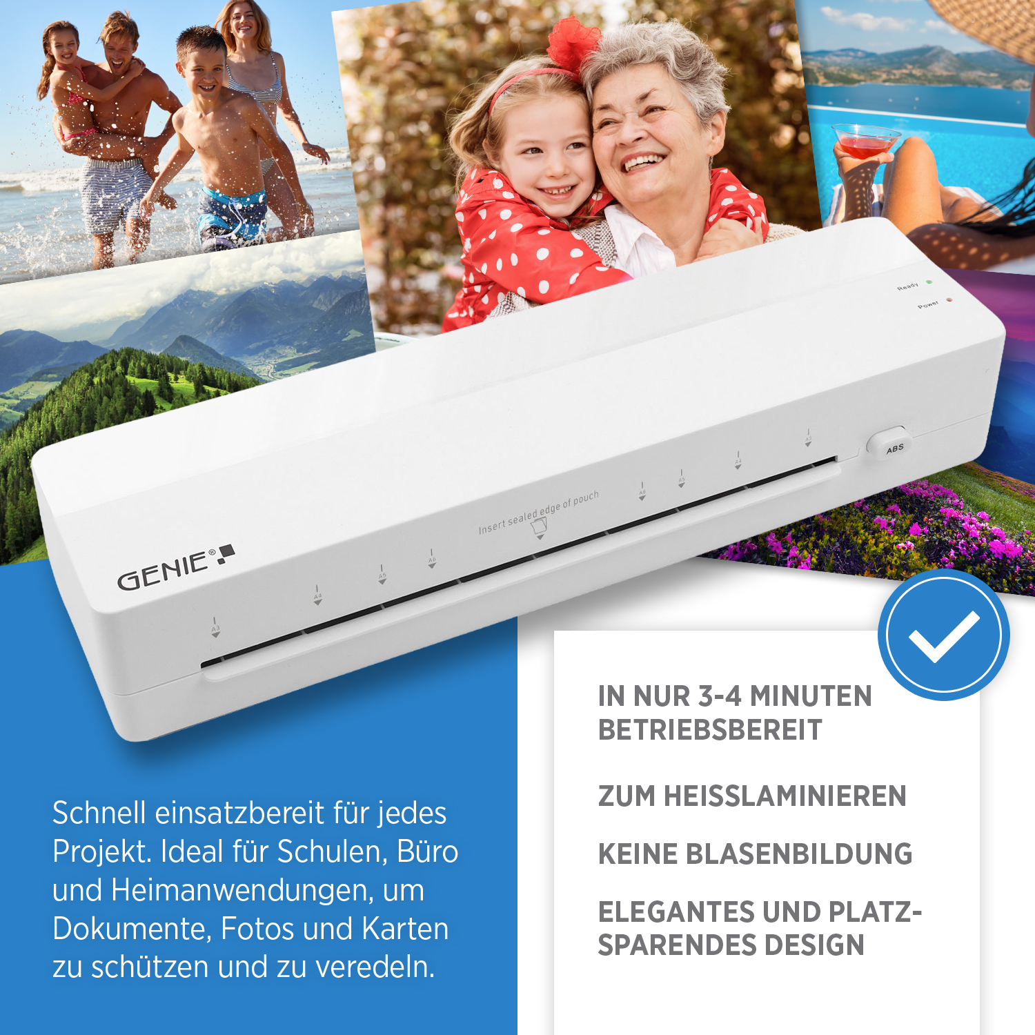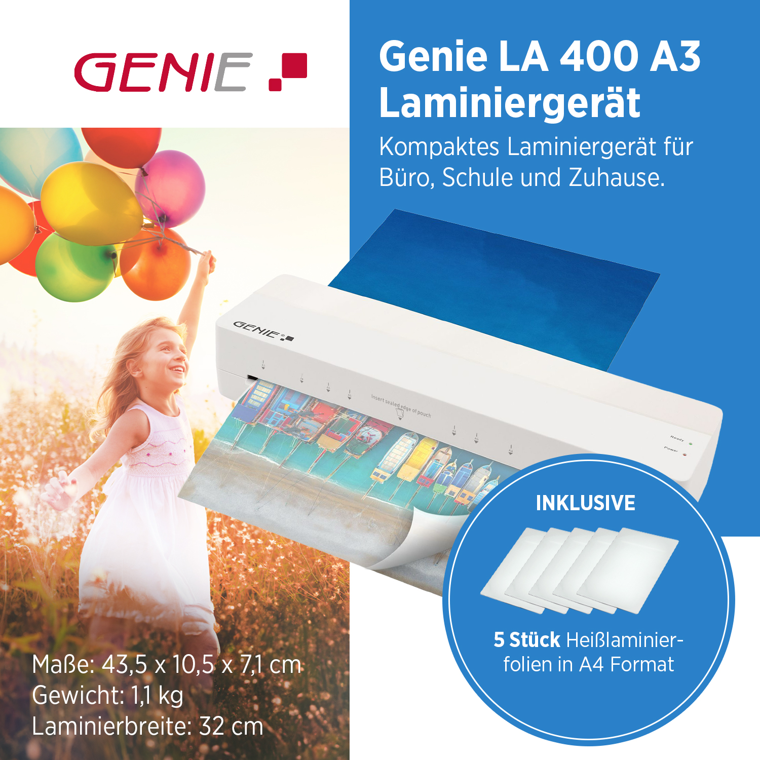 Vielseitiges Heißlaminiergerät GENIE LA 400 für DIN A3-Dokumente. Ideal für Büro, Schule oder Home-Office. Inklusive 5 Laminierfolien (DIN A4, 80 Micron).