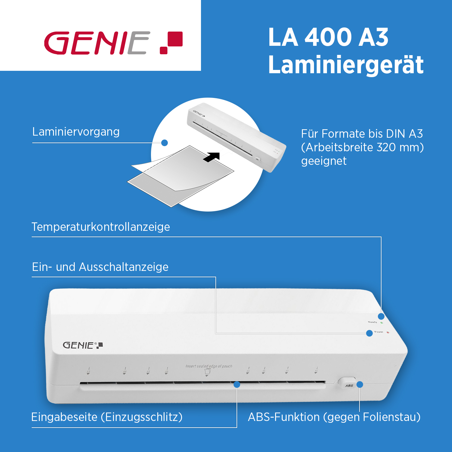 GENIE LA 400 A3 Laminiergerät Heißlaminierung bis DIN A3 inkl. 5 Folien