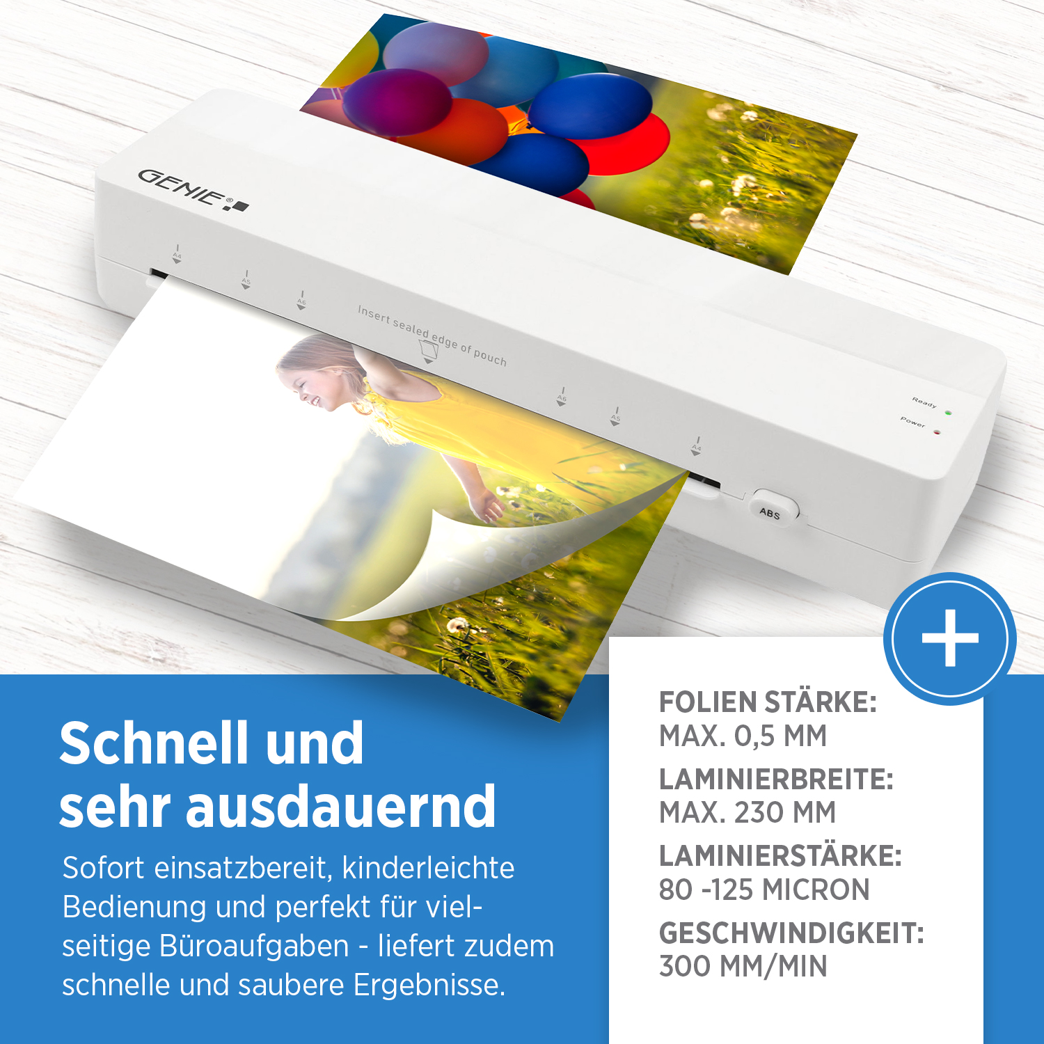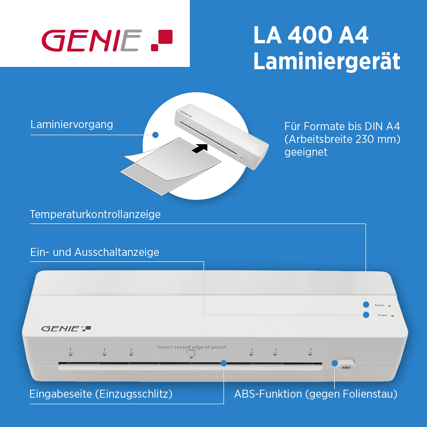Kompaktes Heißlaminiergerät GENIE LA 400 A4 für DIN A4-Dokumente. Ideal für Büro, Schule & Home-Office. Inklusive 5 Laminierfolien (DIN A4, 80 Micron).