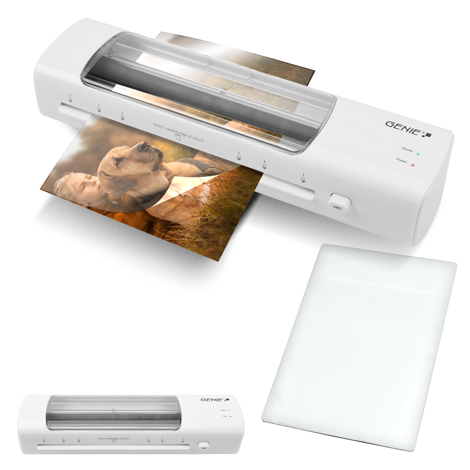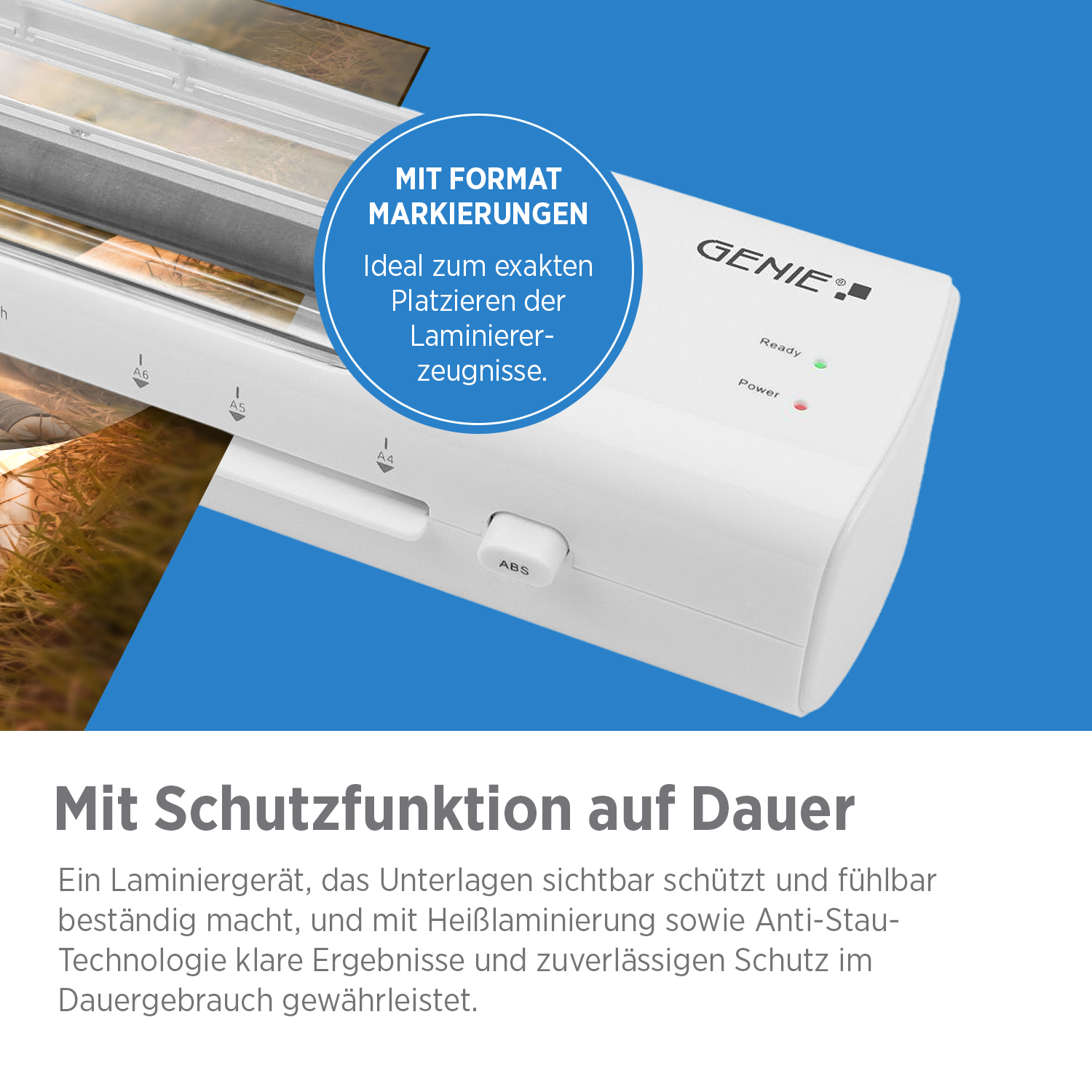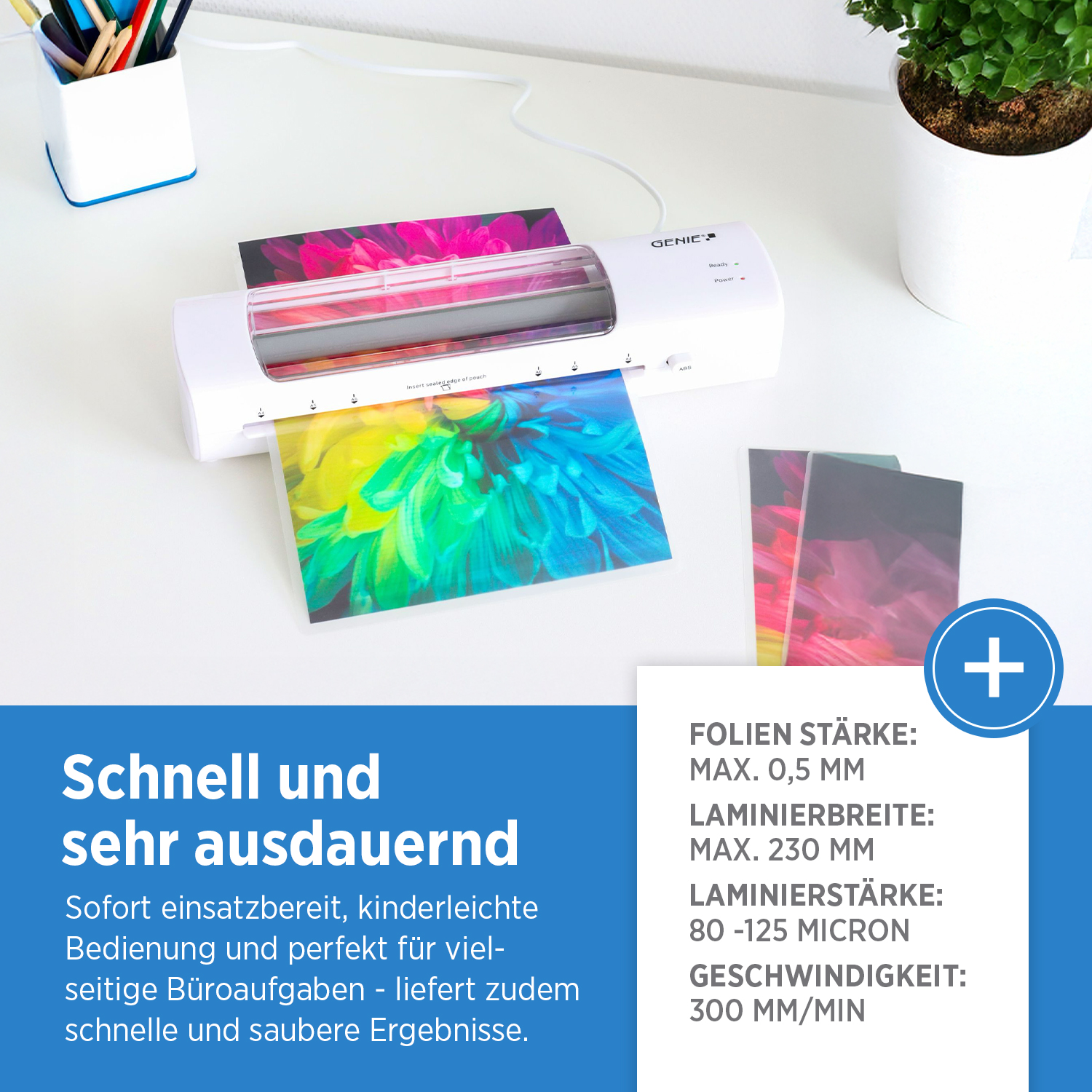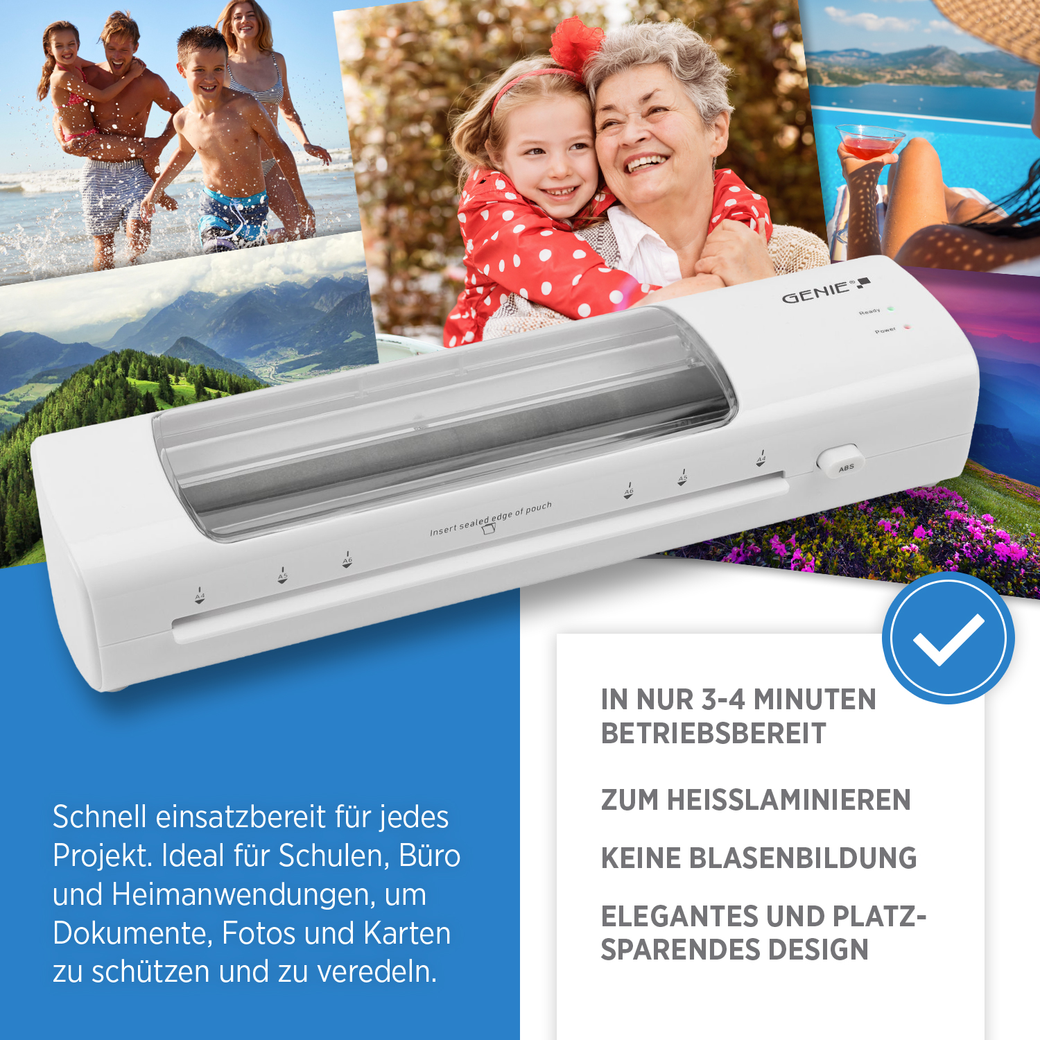 - Kompaktes Heißlaminiergerät GENIE LA 450 T für DIN A4-Dokumente. Mit transparentem Sichtfenster & LED-Beleuchtung. Inklusive 5 Laminierfolien (DIN A4, 80 Micron).