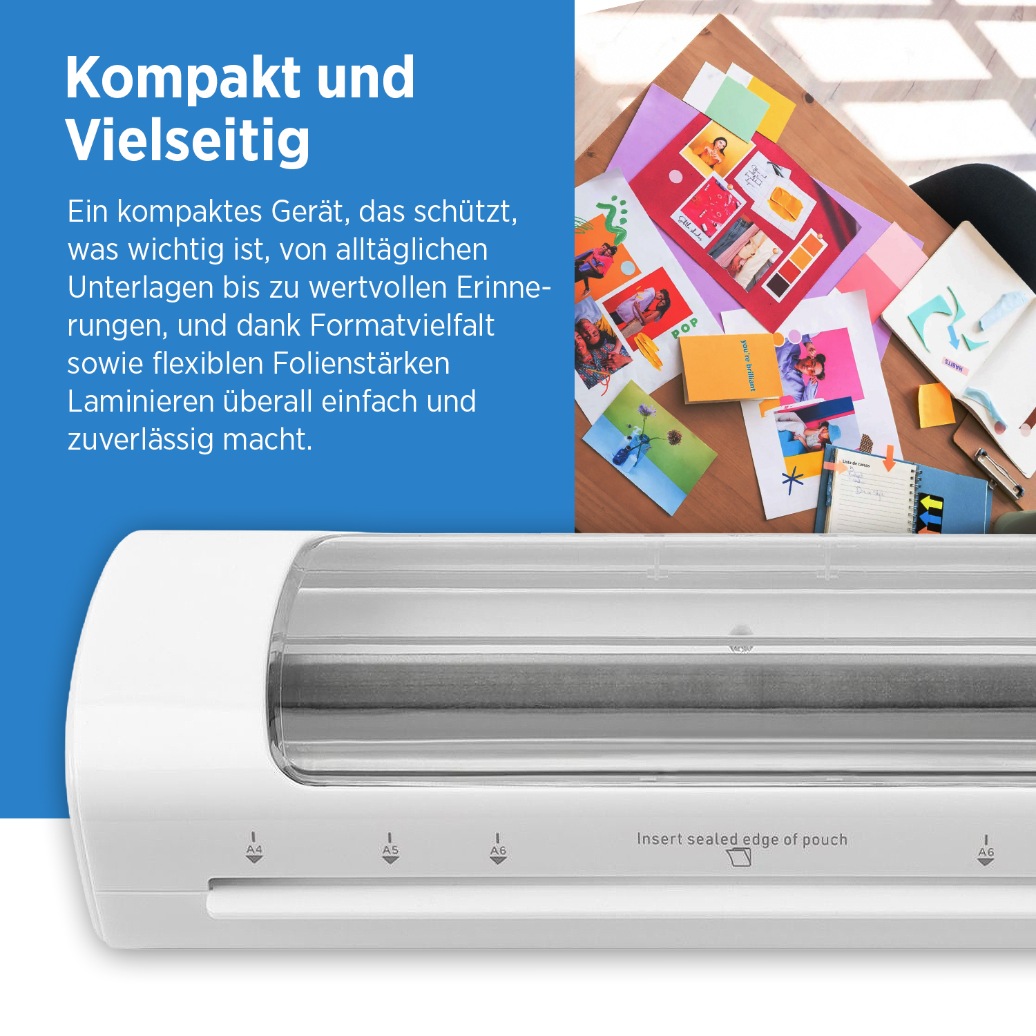 In nur 3–5 Minuten ist das Laminiergerät aufgeheizt und einsatzbereit. Im Lieferumfang sind bereits fünf Laminierfolien DIN A4 (80 Micron) enthalten, sodass sofort mit dem Laminieren begonnen werden kann.