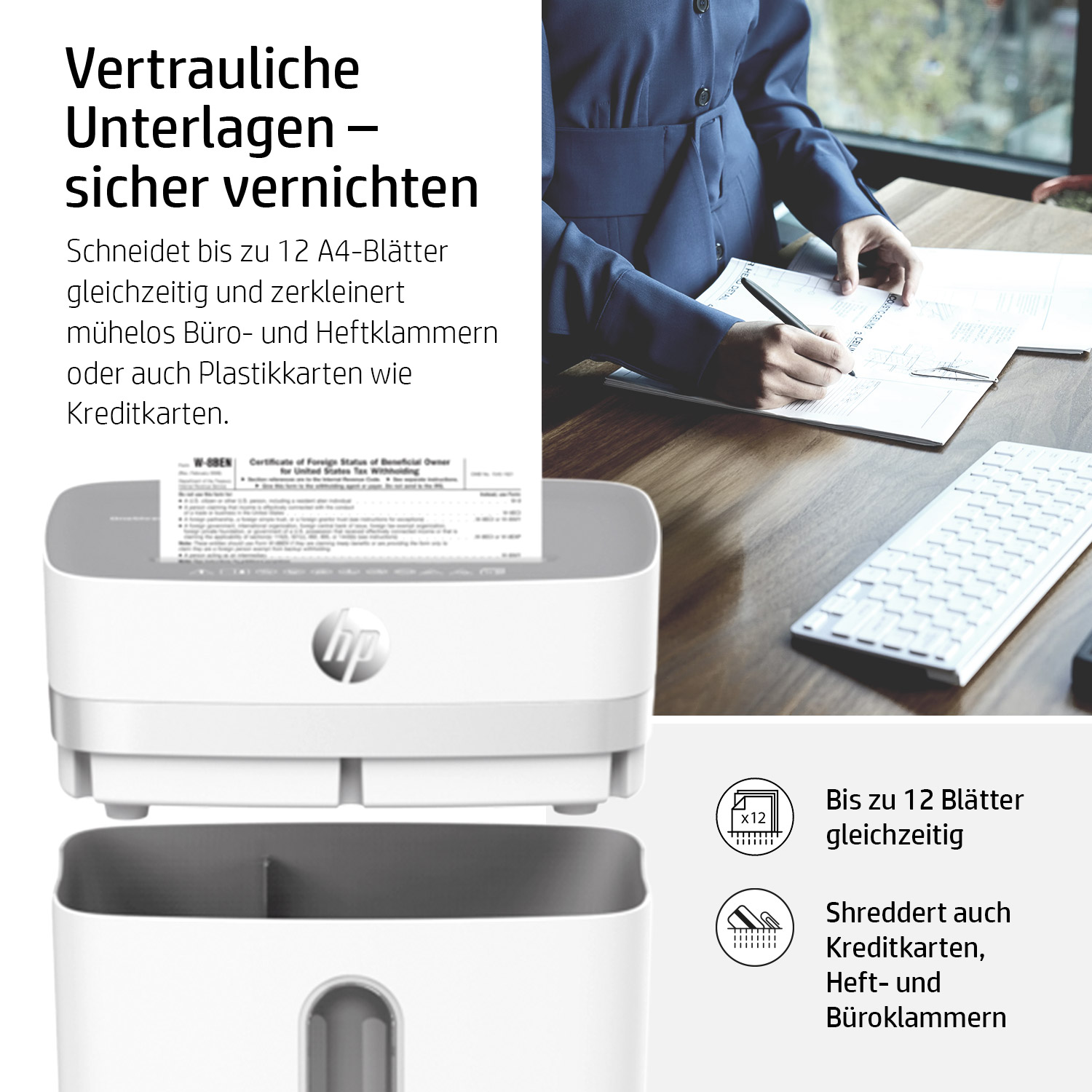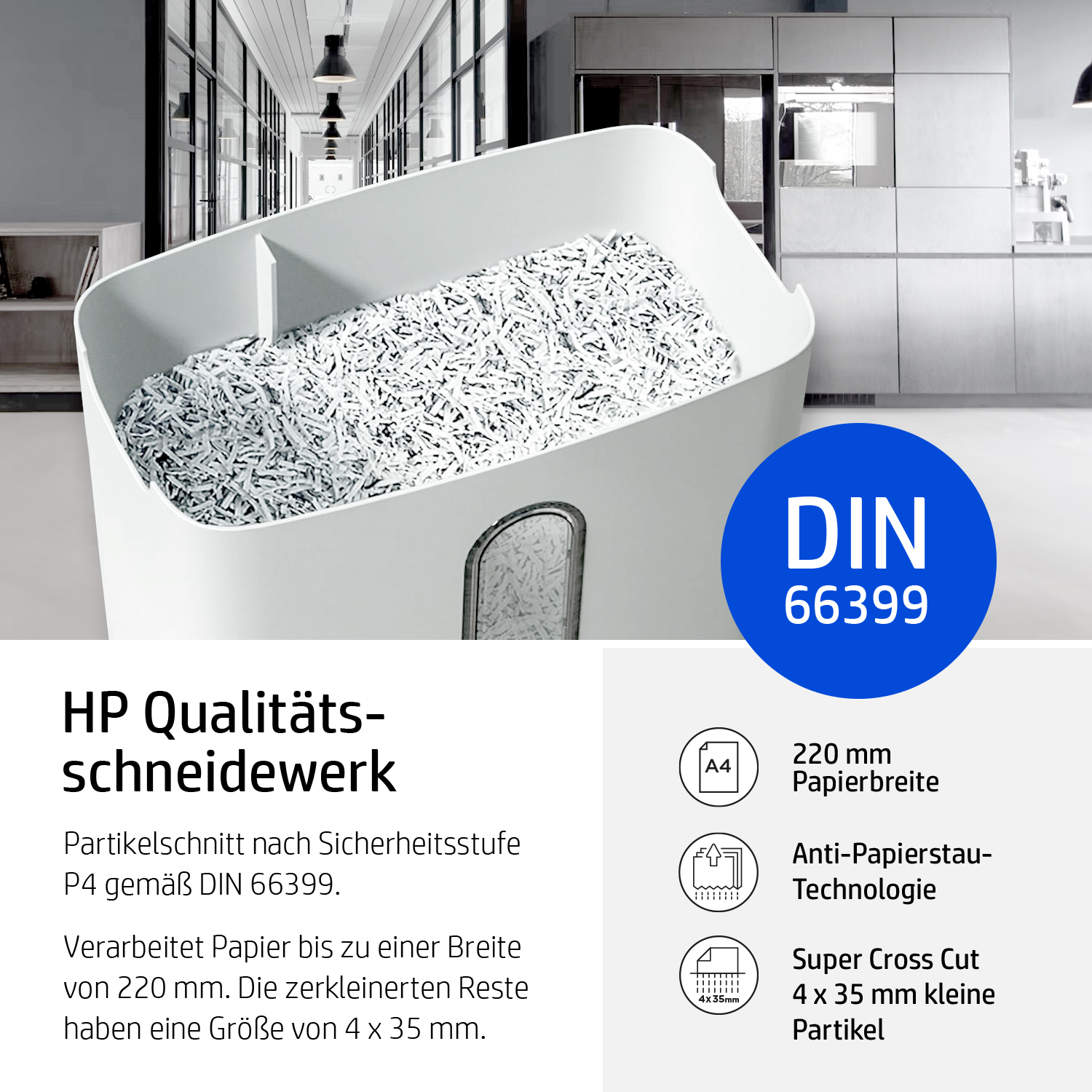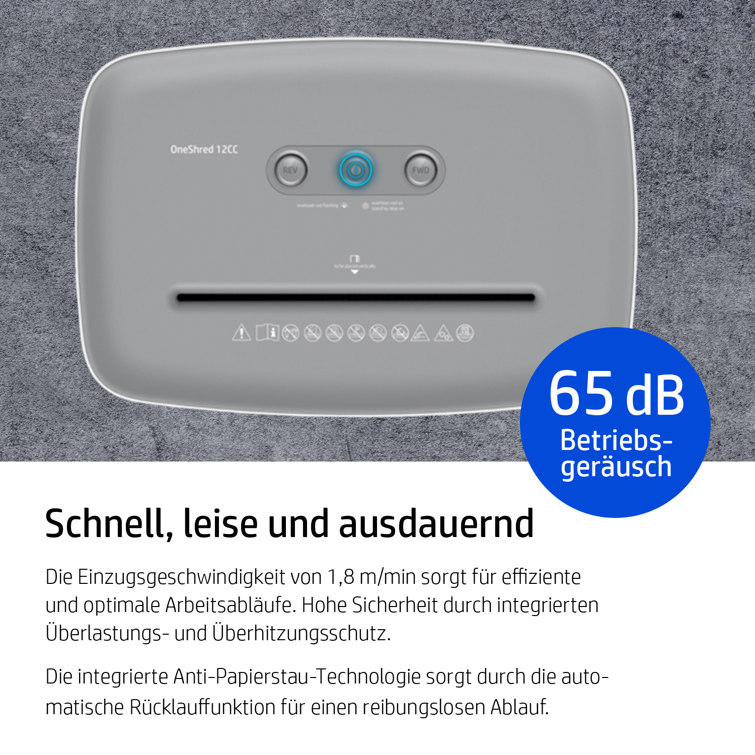 Der kompakte HP OneShred 12CC vernichtet Ihre sensiblen Unterlagen im Cross Cut in 4 mm x 35 mm kleine Partikel und gehört in jedes Home-Office. Der zuverlässige Papier-Shredder glänzt mit der hohen Sicherheitsstufe P-4 und erfüllt somit die Anforderungen der Datenschutz-Grundverordnung zur Vernichtung personenbezogener Dokumente. Mit einer Schnittgeschwindigkeit von 1,8 Meter pro Minute zerkleinert der moderne Aktenvernichter zügig bis zu 12 Blätter gleichzeitig im Partikelschnitt. Haben Sie versehentlich mehr als 12 Blätter zugeführt, wird das Papier dank der Auto-Reverse-Funktion automatisch wieder zurückgegeben, um einem Papierstau entgegenzuwirken. Das mühsame Entfernen von Heft- und Büroklammern vor dem Shredder-Vorgang entfällt, da sie dem HP OneShred 12CC ebenso wenige Schwierigkeiten bereiten wie das Zerkleinern von Kreditkarten.