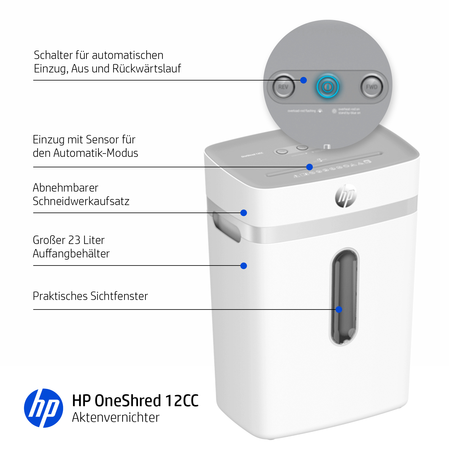- Abfallbehälter: 23 Liter mit abnehmbarem Shredder-Kopf und Sichtfenster