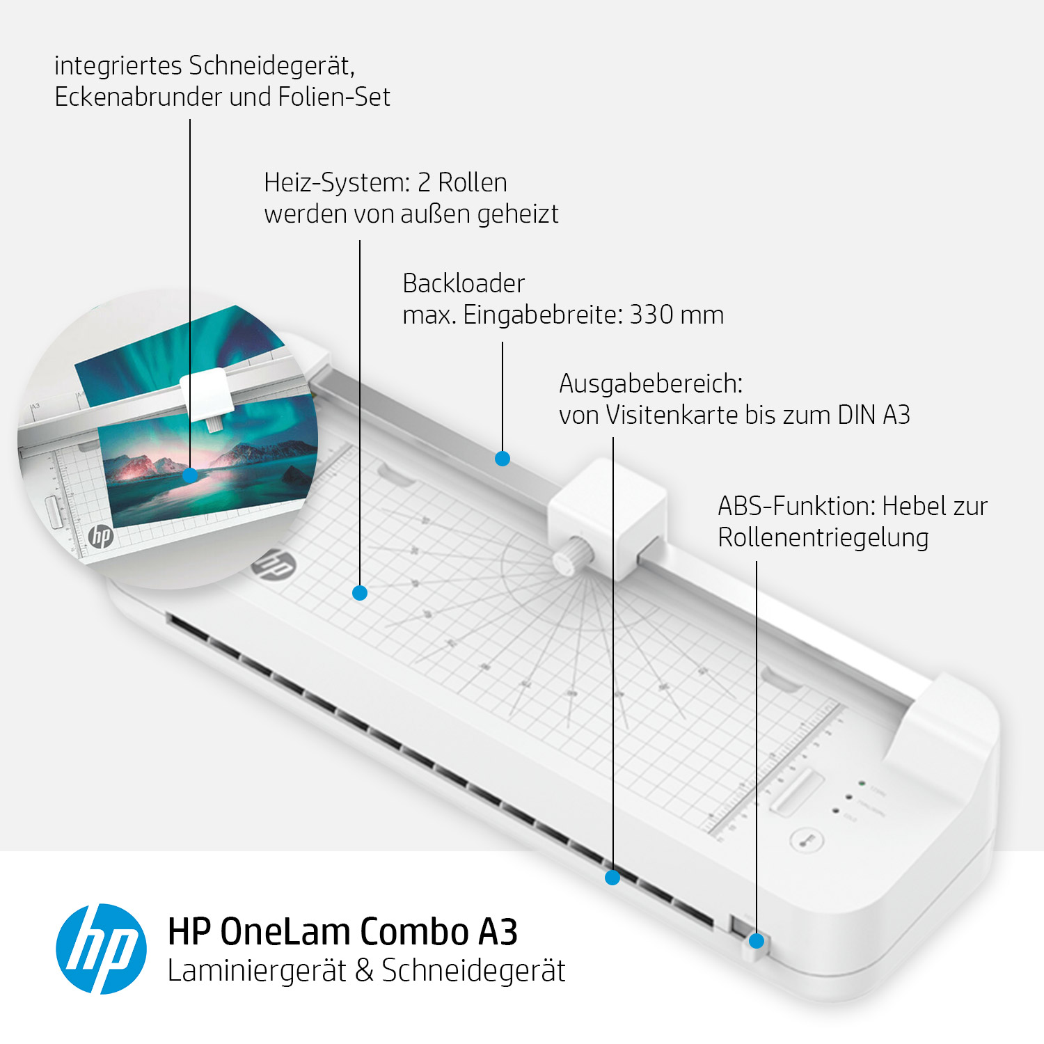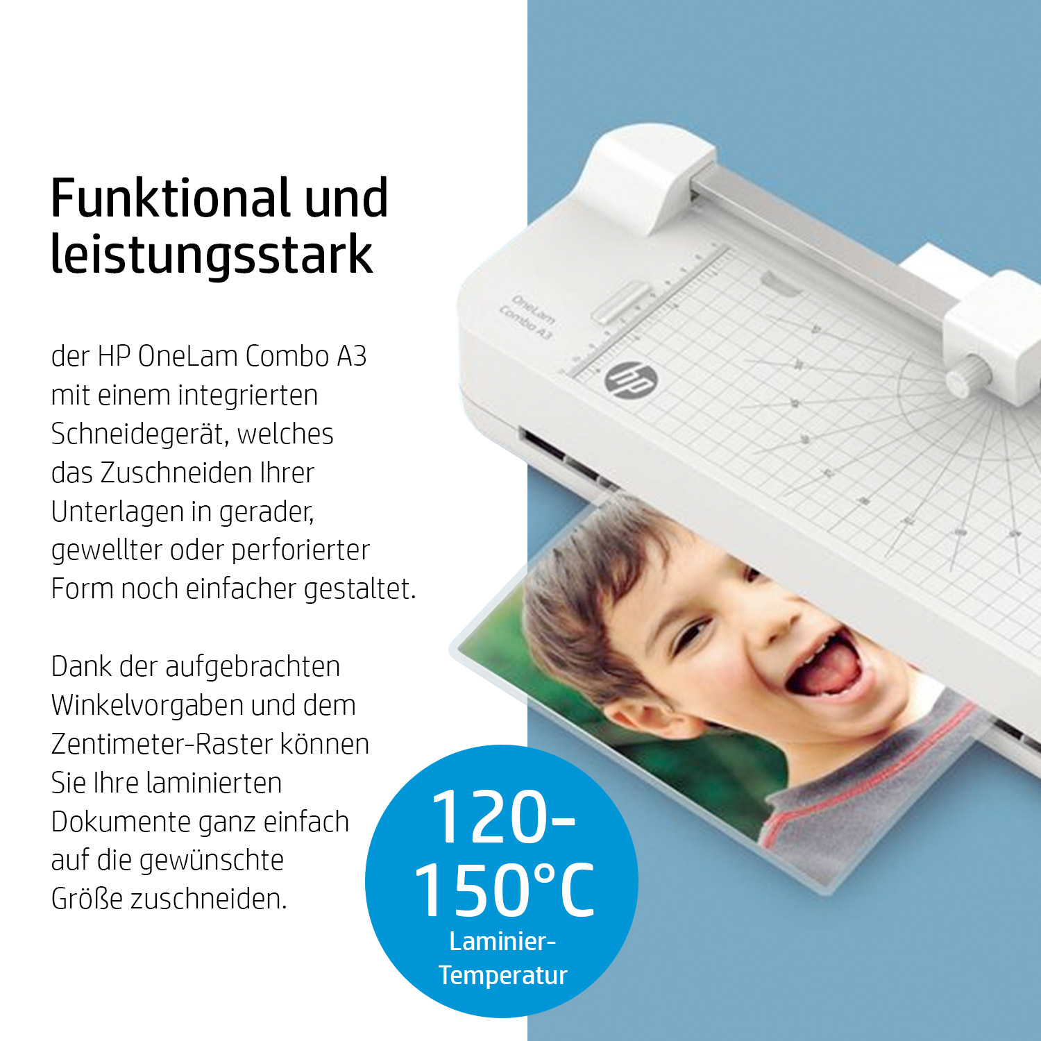 Im Vergleich zum HP OneLam 400 punktet der HP OneLam Combo A3 mit einem integrierten Schneidegerät, welches das Zuschneiden Ihrer Unterlagen in gerader, gewellter oder perforierter Form noch einfacher gestaltet. Dank der aufgebrachten Winkelvorgaben und dem Zentimeter-Raster können Sie Ihre laminierten Dokumente ganz einfach auf die gewünschte Größe zuschneiden. Wie die übrigen Laminiergeräte aus der HP OneLam-Serie, ist auch dieser praktische Backloader sowohl zum Heiß- als auch Kaltlaminieren geeignet. Mit einer Folienstärke von 75/80 Micron bis 125 Micron können Sie Ihre Bilder, Stundenpläne oder wichtige Dokumente von der Visitenkarte bis hin zum DIN A3-Format vor Schmutz und Feuchtigkeit schützen.