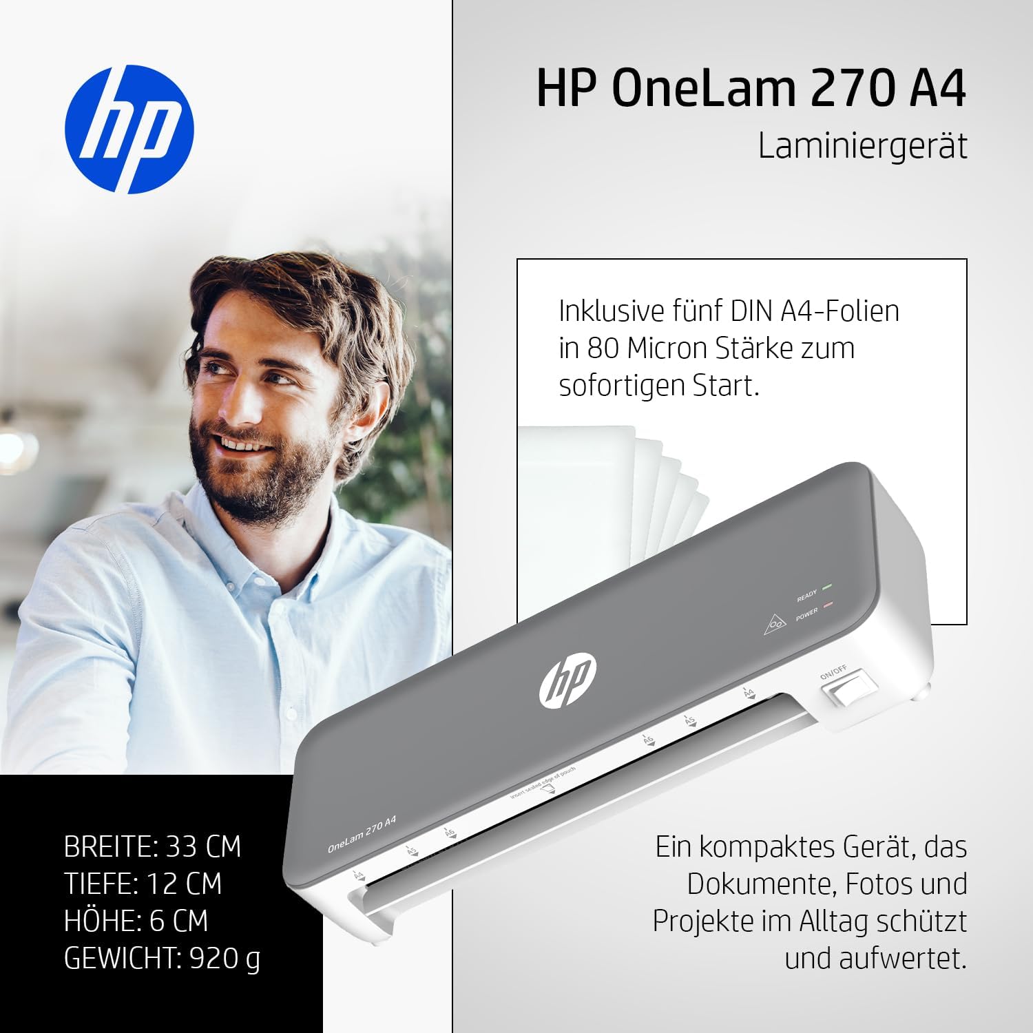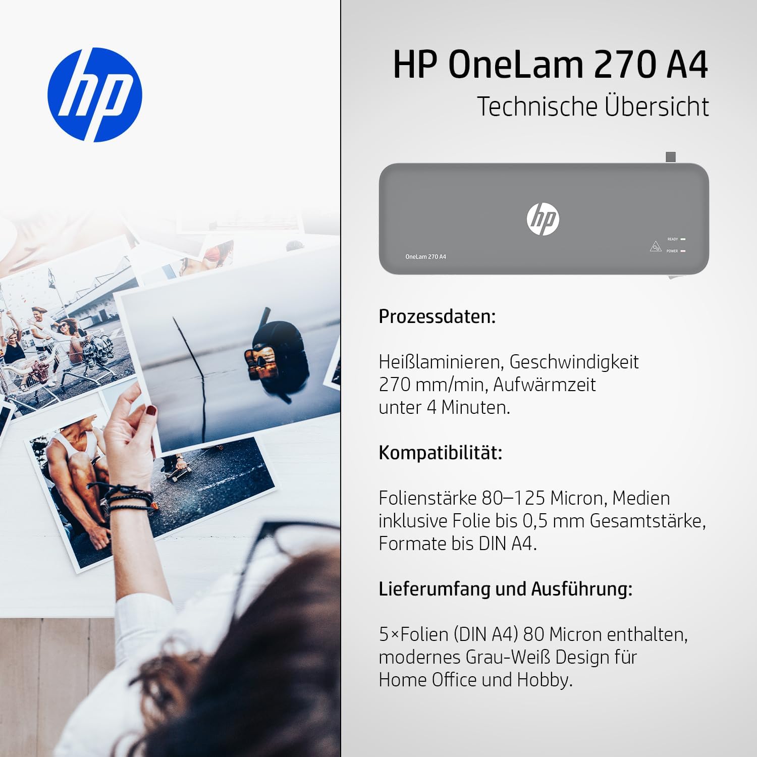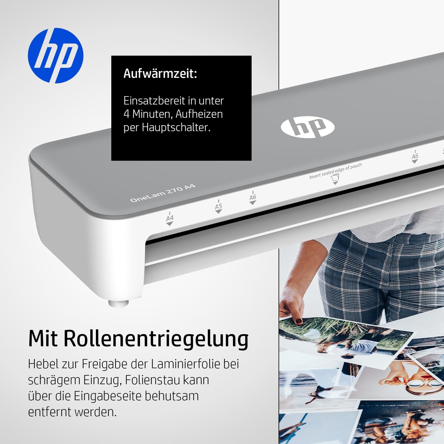 Der HP OneLam 270 A4 bietet dir einfache Bedienung, schnelle Einsatzbereitschaft und hochwertige Laminierergebnisse – ein zuverlässiger Begleiter für den täglichen Einsatz zu Hause oder im Büro.