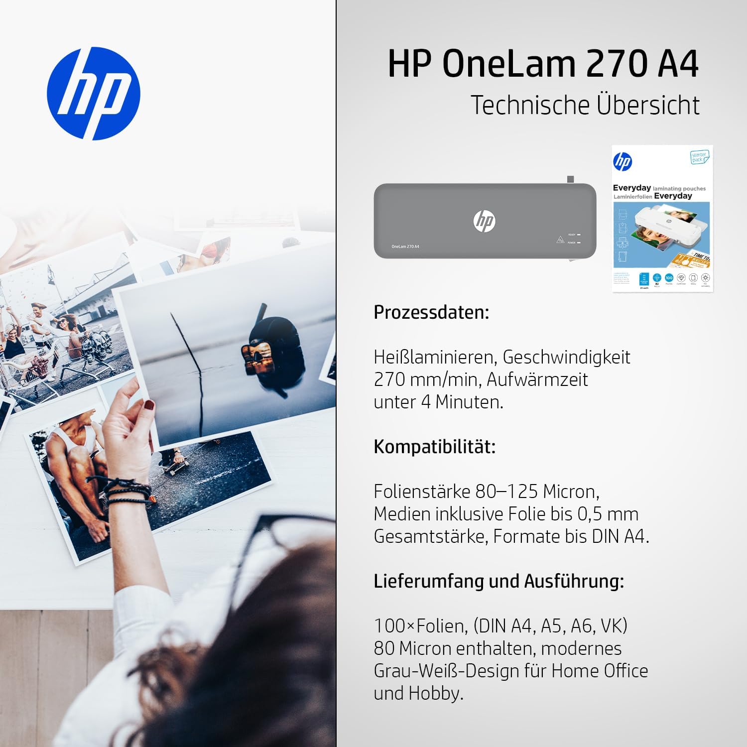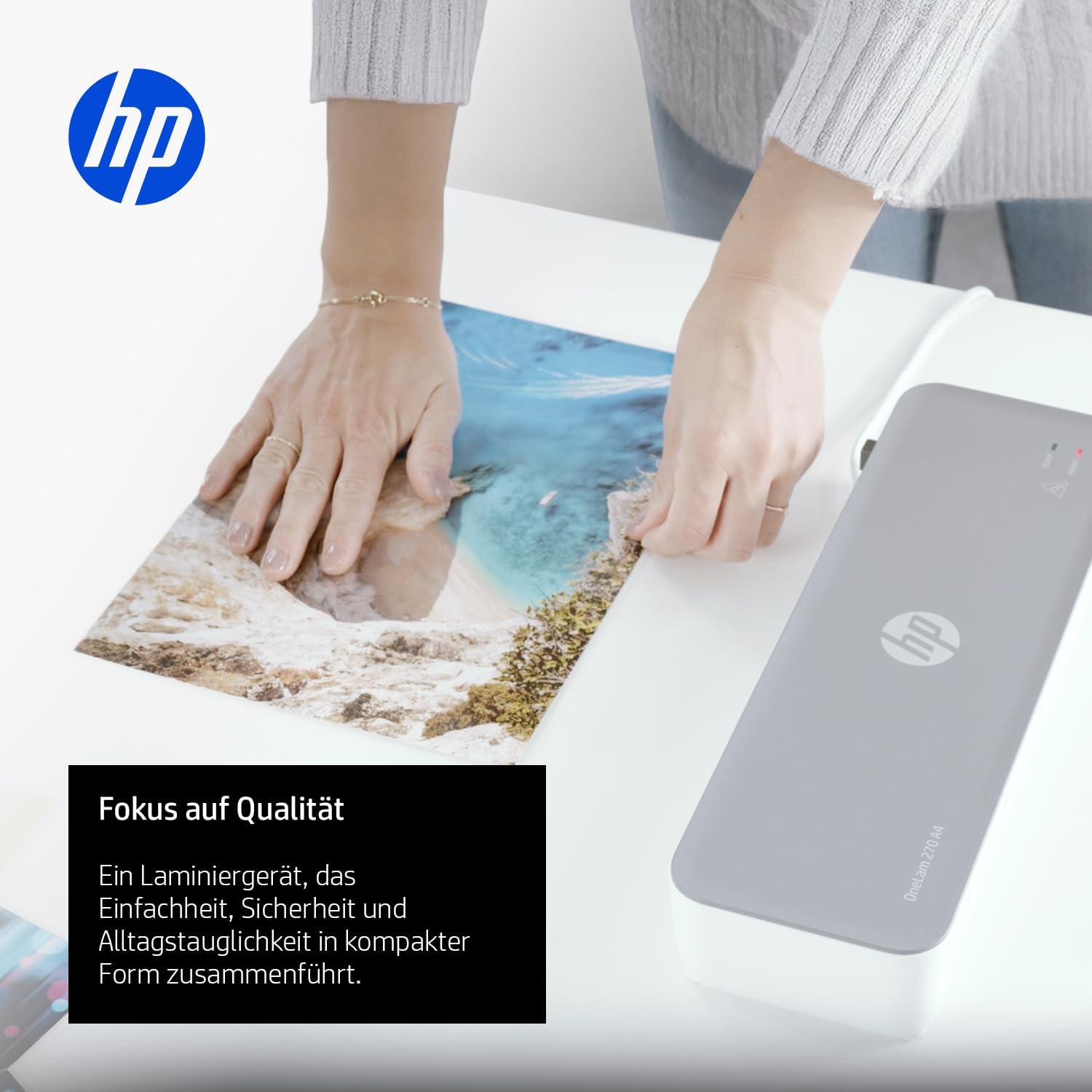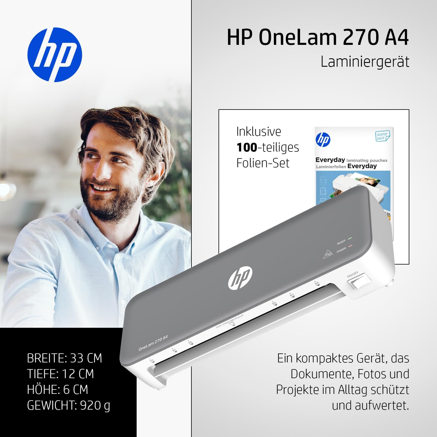 HP OneLam 270 A4 Laminiergerät + Laminierfolien Starter-Set (100 Stück) – Komplettset für Büro, Schule & zuhause