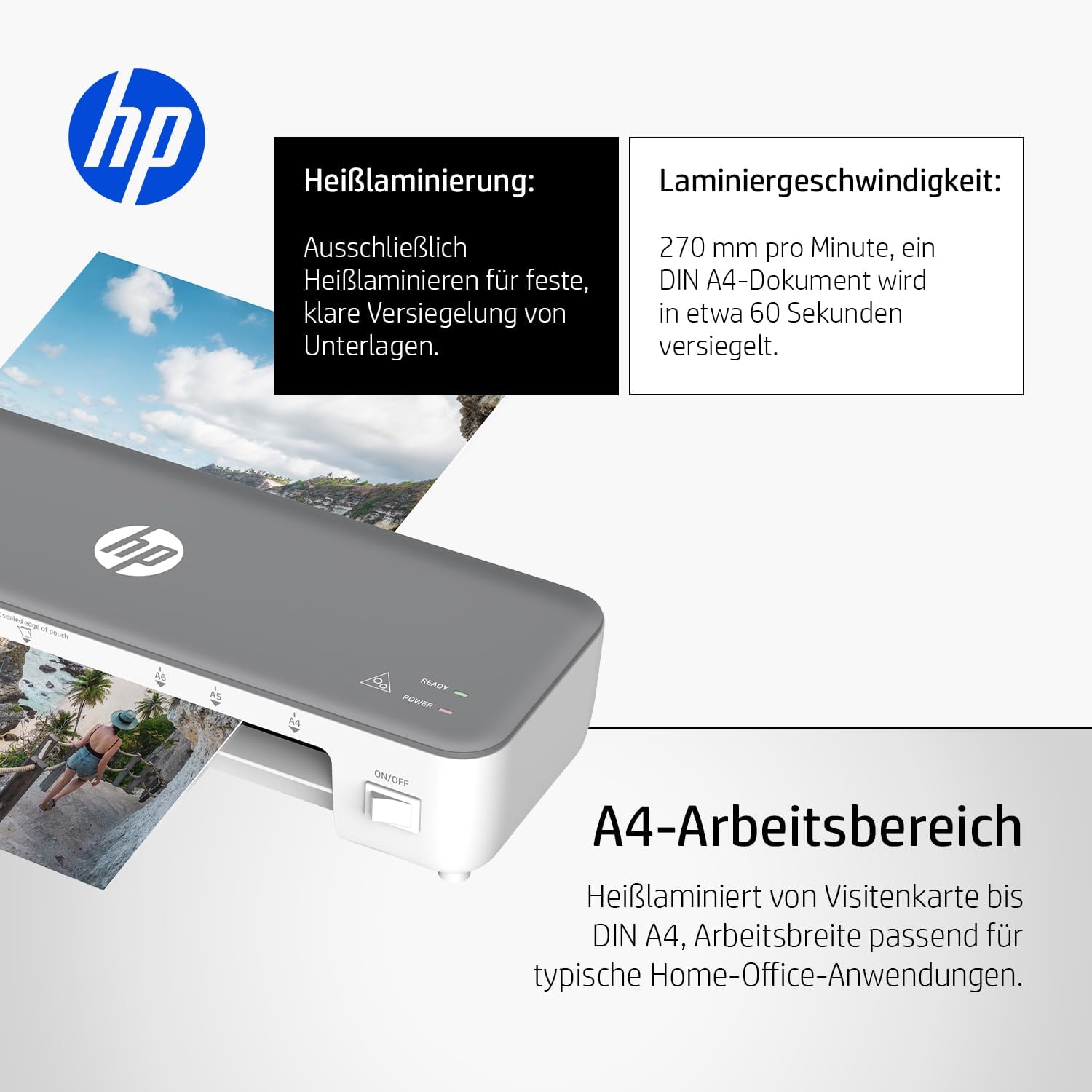 Der HP OneLam 270 A4 ist ein kompaktes, modernes Heißlaminiergerät, das perfekt für Home-Office, Hobbyprojekte, Bastelarbeiten und schulische Anwendungen geeignet ist. Er ist in unter 4 Minuten aufgewärmt und laminiert zuverlässig Dokumente von der Visitenkarte bis zum DIN A4-Format.