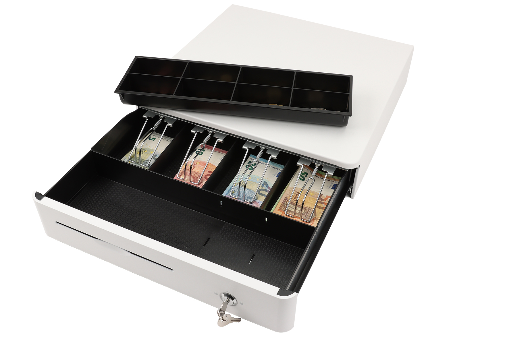 Kassenlade M405 Color Vollmetall 8 Münz- & 4 Schein-Fächer Schloss weiß