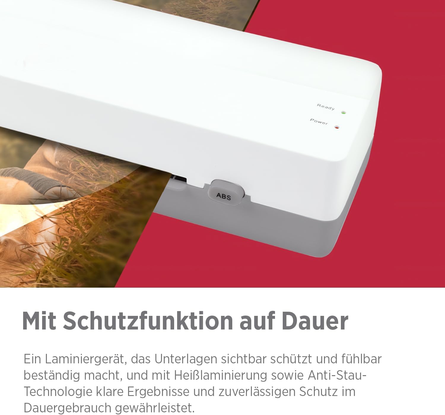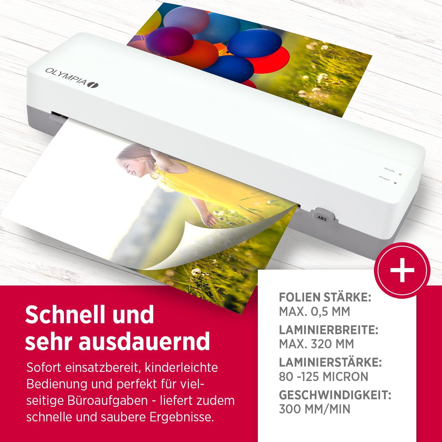 Dank der ABS-Funktion werden Folienstaus unkompliziert gelöst, während zwei LED-Lampen jederzeit den Betriebsmodus anzeigen. Damit Sie sofort starten können, sind bereits 5 Heißlaminierfolien DIN A4 (80 Micron) im Lieferumfang enthalten.