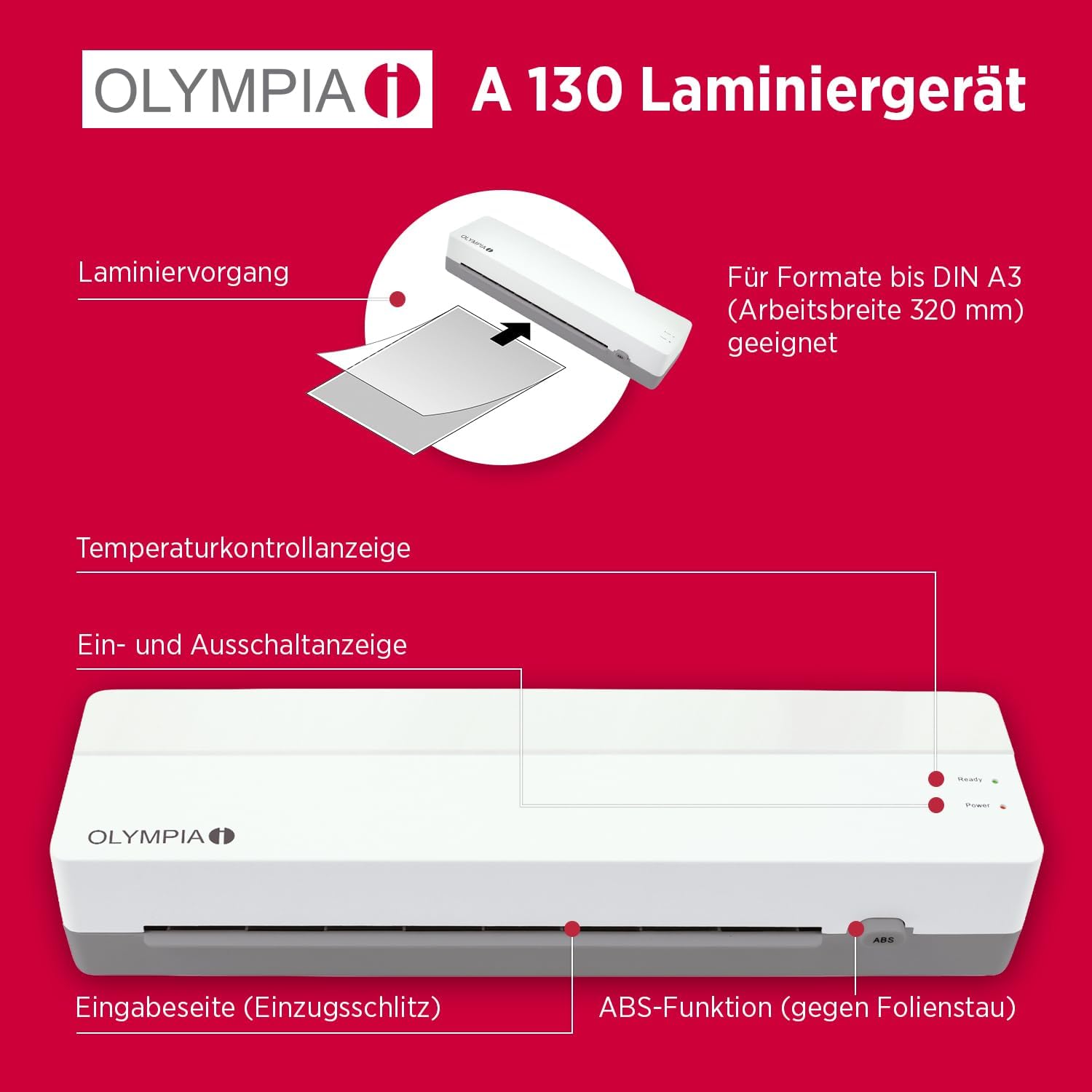 Olympia A 130 Laminiergerät DIN A3 Heißlaminieren ABS-Funktion 5 Folien inkl.