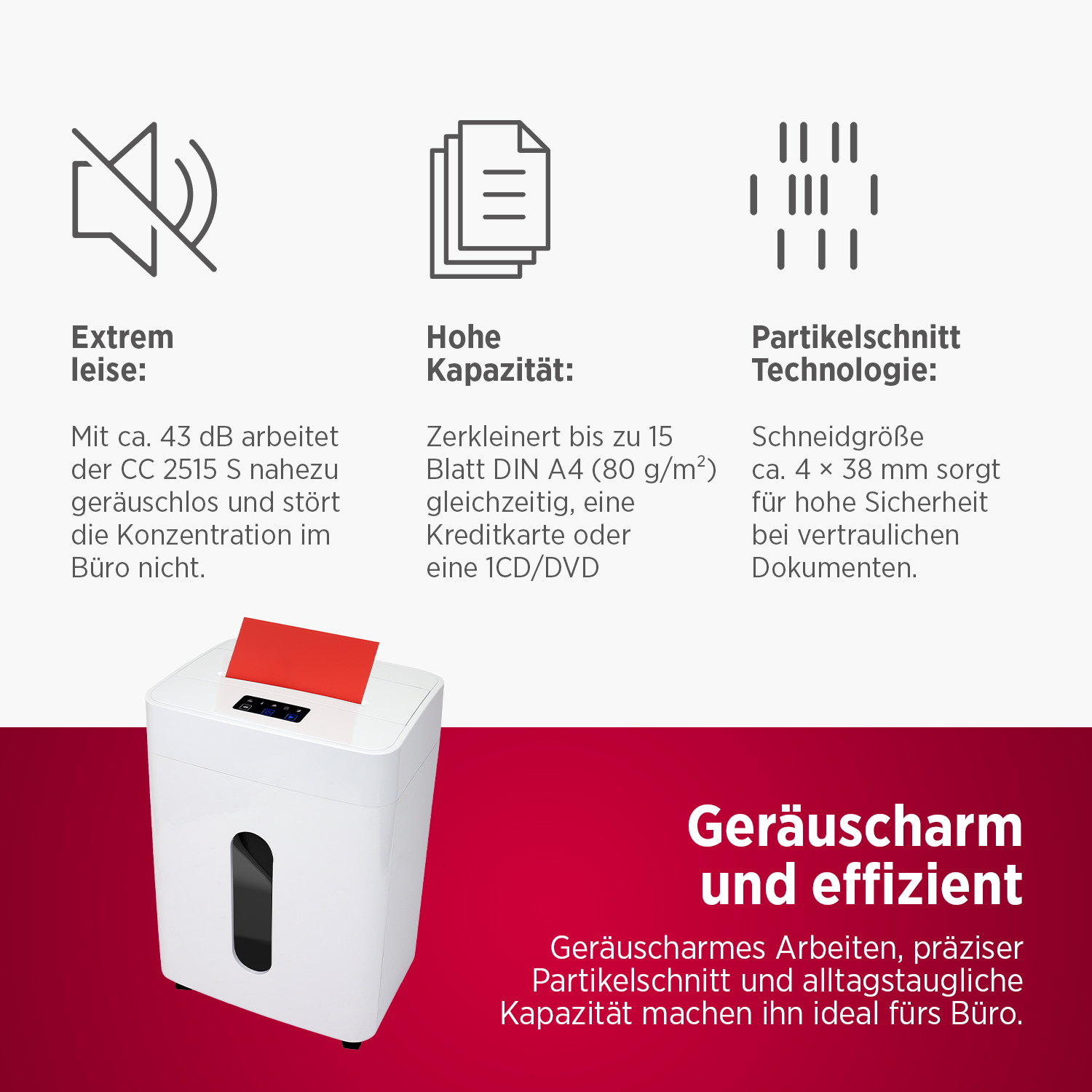Dank Partikelschnitt (4 × 38 mm) erfüllt er die Sicherheitsstufe P-4 nach DIN 66399 und gewährleistet zuverlässigen Datenschutz. Mit einer Kapazität von bis zu 15 Blatt Papier DIN A4, sowie der Möglichkeit CDs, DVDs und Kreditkarten zu vernichten, ist er besonders vielseitig.