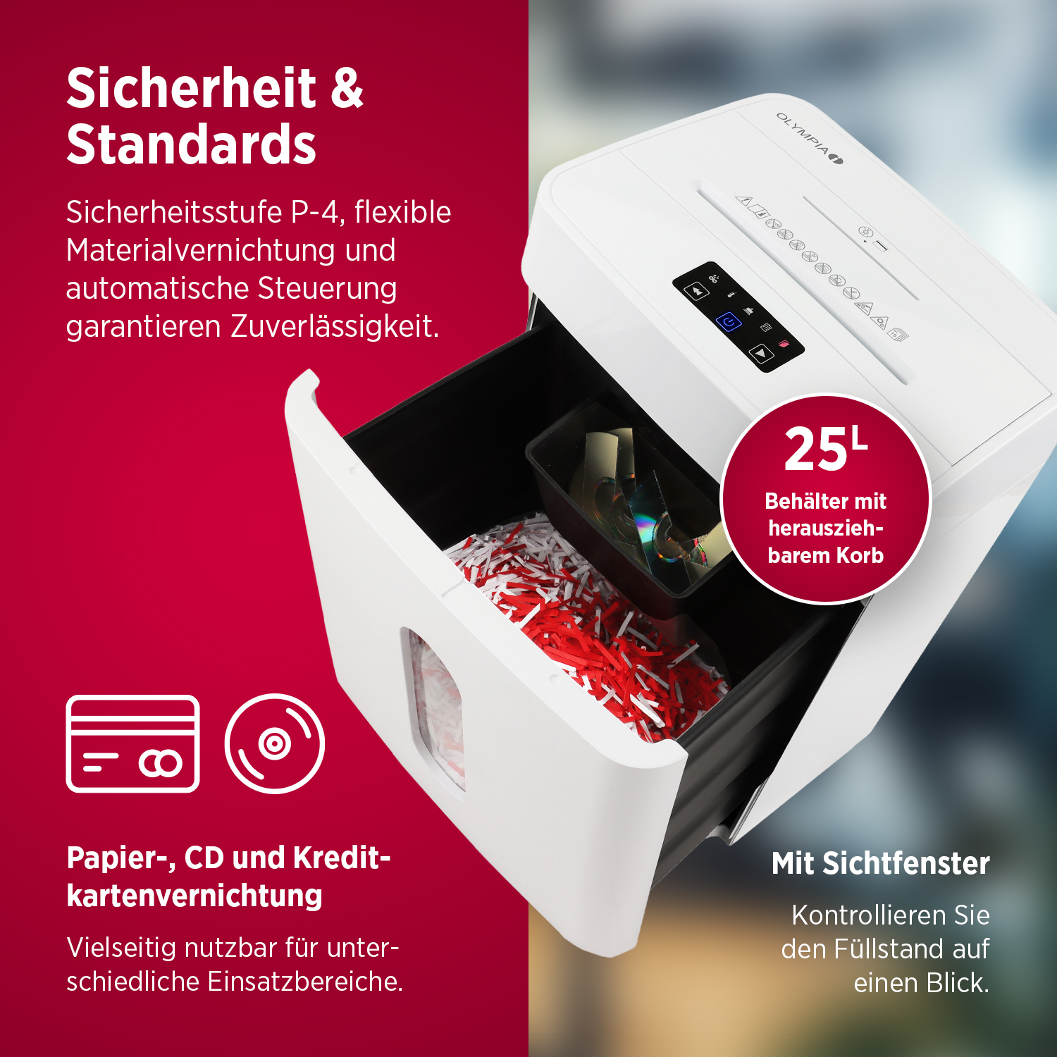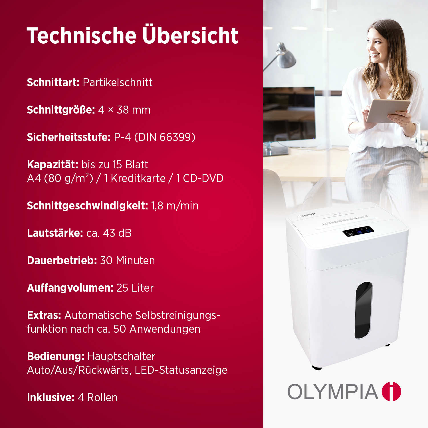 Komfortfunktionen wie die automatische Start-/Stopp-Funktion, die LED-Statusanzeige für Papierstau, Überhitzung oder vollen Behälter und die Selbstreinigungsfunktion machen die Bedienung einfach und sicher. Der herausziehbare 25-Liter-Auffangkorb mit Sichtfenster, sowie die beweglichen Rollen sorgen für höchsten Komfort im Alltag.