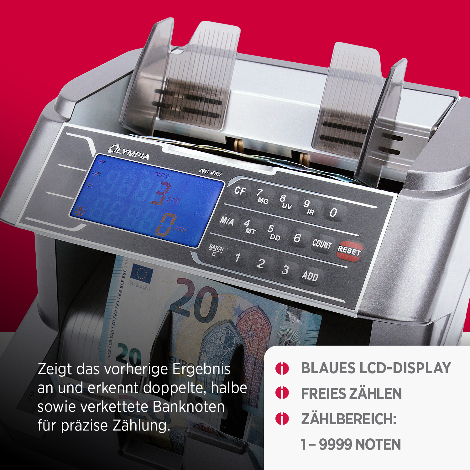 Legen Sie einen Stapel sortierter EUR-Banknoten in das Aufnahmefach und der OLYMPIA NC 455 Banknotenzähler erkennt dank 2D-Formaterkennung die Art der Banknote. Im Einzug finden bis zu 300 Banknoten Platz. Auf dem großen LCD-Display können Sie darauf die Menge an Geld und die Anzahl der Scheine ablesen.
