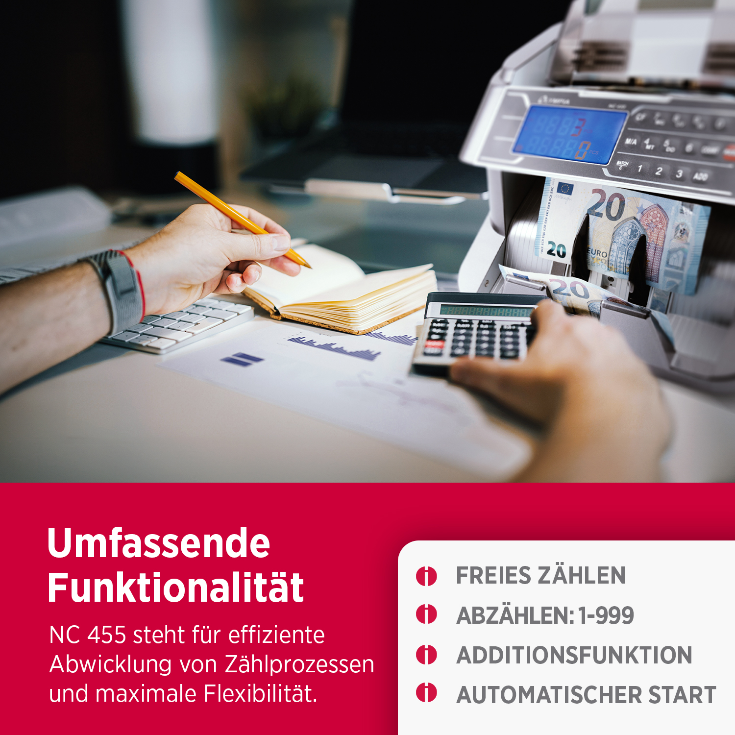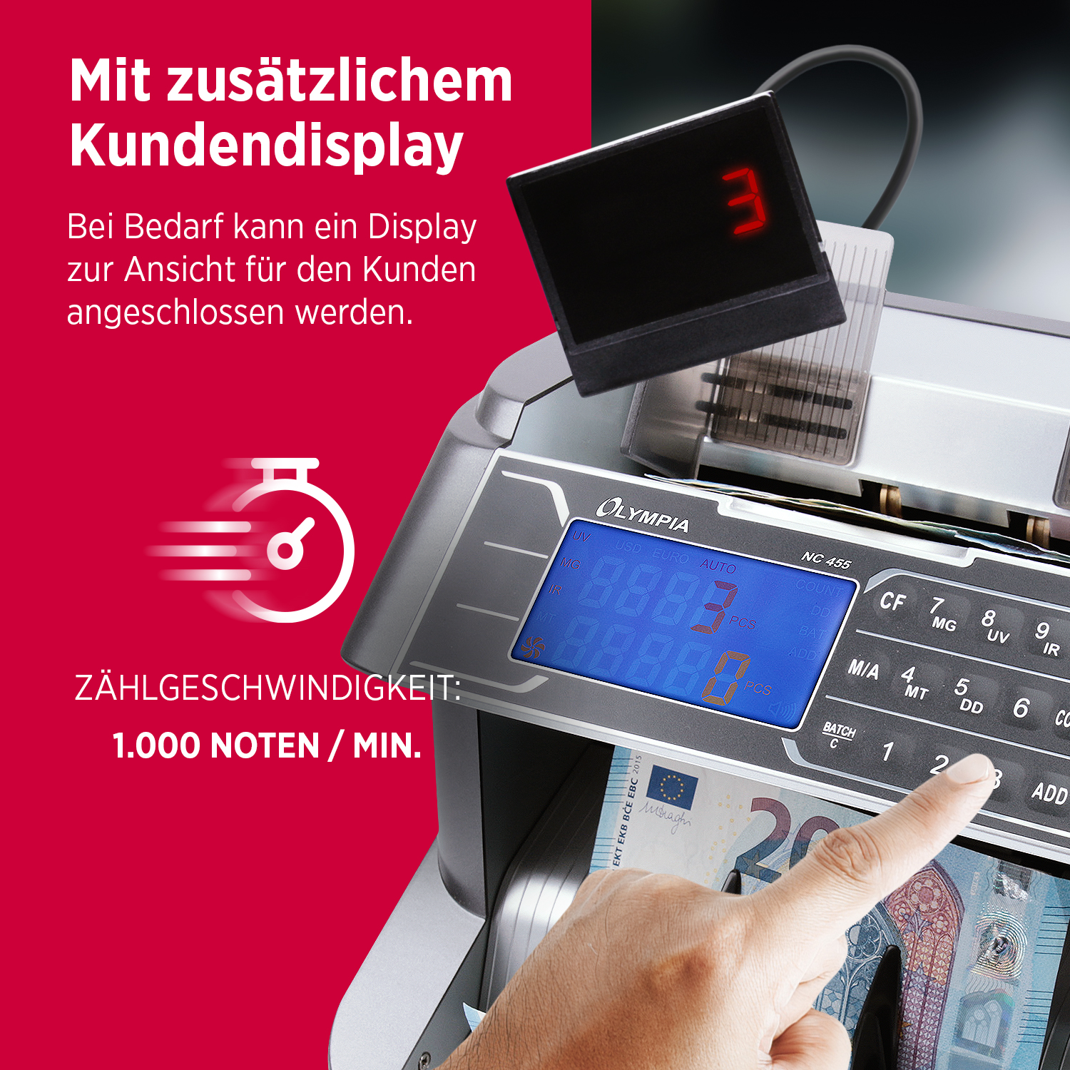 Der OLYMPIA NC 455 Banknotenzähler ist die perfekte Lösung für die sichere und effiziente Zählung großer Mengen an Geldscheinen. Mit einer Geschwindigkeit von bis zu 1.000 Banknoten pro Minute und der Fähigkeit, bei jedem Durchlauf Echtheitsprüfungen durchzuführen, können Sie sich der Genauigkeit und Sicherheit Ihrer Bargeldabwicklung sicher sein. Der NC 455 erkennt jeden Euro-Schein und sortiert sie automatisch, während das große LCD-Display alle wichtigen Informationen anzeigt. Mit dem externen Display können Sie die Menge an Geld und die Anzahl der Scheine noch besser im Blick behalten. Die verschiedenen Sensoren für UV, MG, MT und DD, die Doppel-, Halbe- und Ketten-Erkennung sowie der Zählbereich von 1-9999 Noten machen den OLYMPIA NC 455 zum perfekten Helfer für alle, die häufig mit Bargeld umgehen müssen.