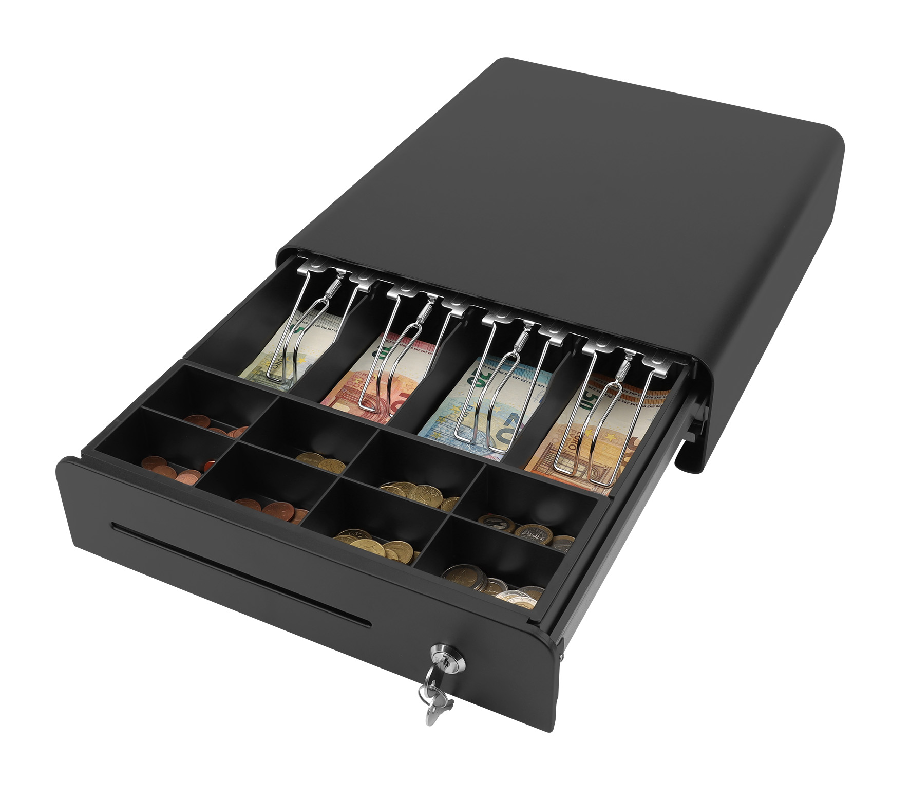 - Fächer: 8 Münzfächer, 4 Scheinfächer