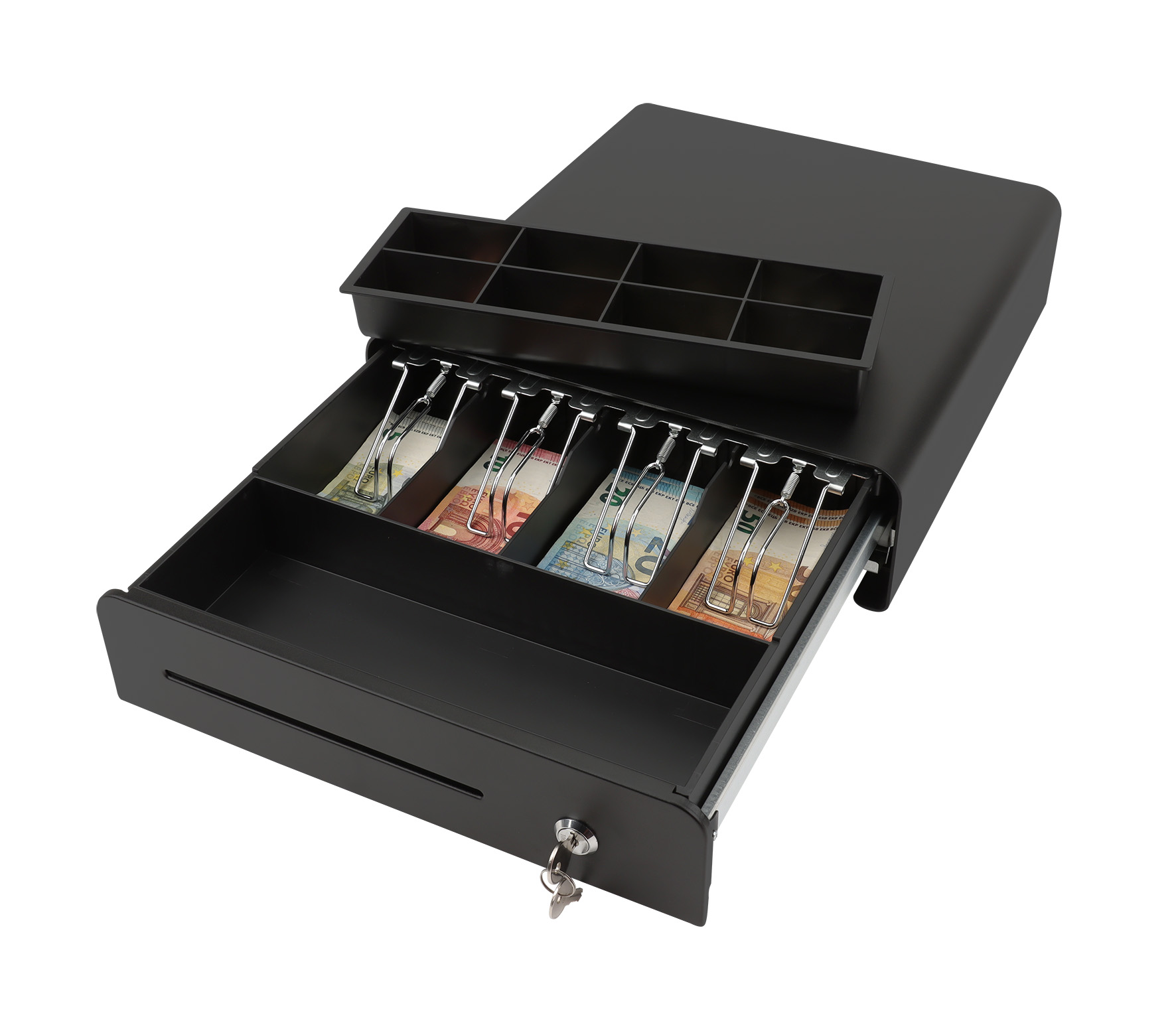 Die Kassenschublade verfügt über 8 Münz- und 4 Scheinfächer, die eine übersichtliche und sichere Aufbewahrung von Bargeld ermöglichen. Das herausnehmbare Münz- und Scheinfach erleichtert die Kassenabrechnung und sorgt für mehr Flexibilität im Arbeitsalltag. Ein integrierter Separierungsschlitz ermöglicht das Einwerfen von Belegen, Gutscheinen oder Barzahlungen, ohne die Lade öffnen zu müssen.
