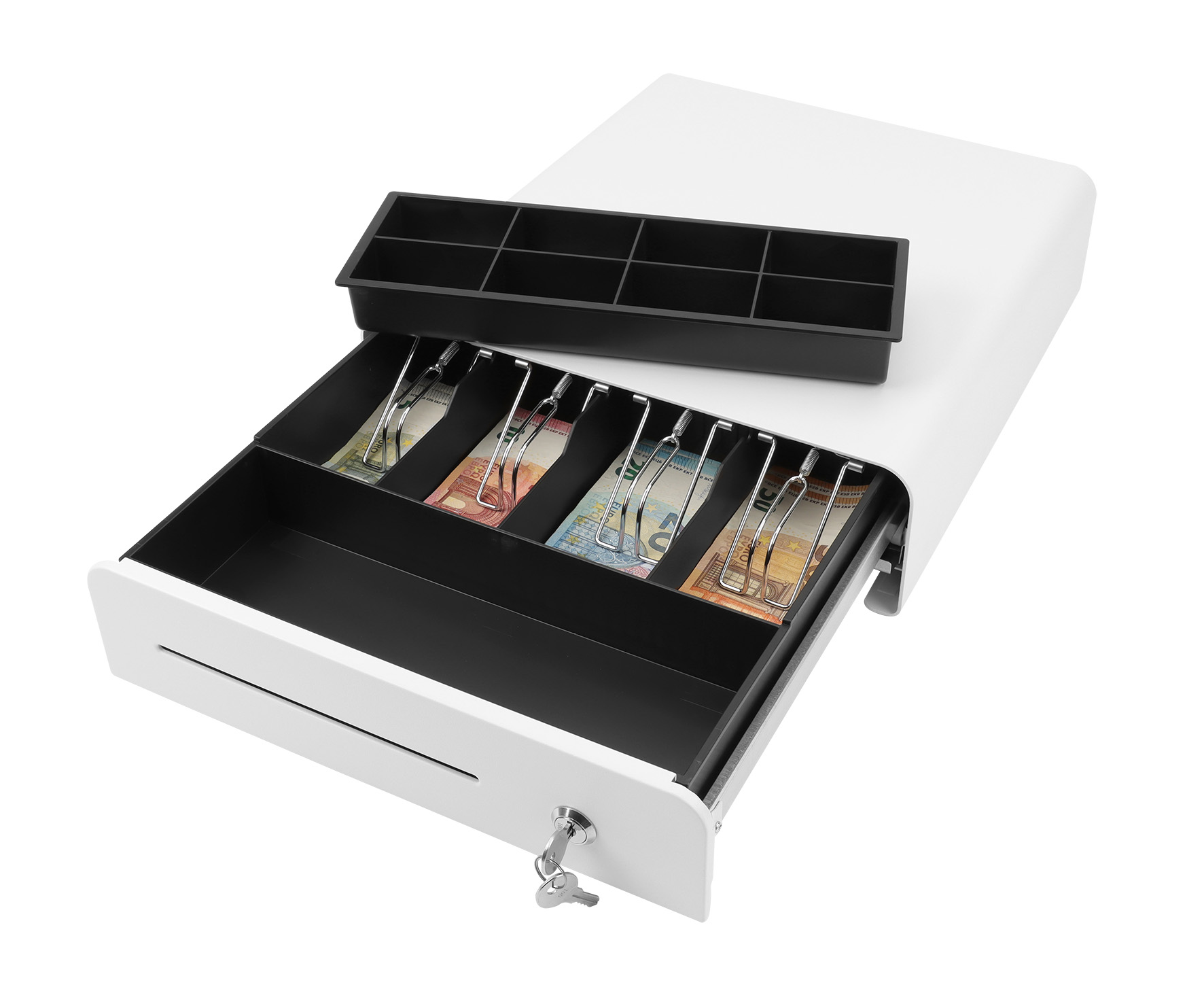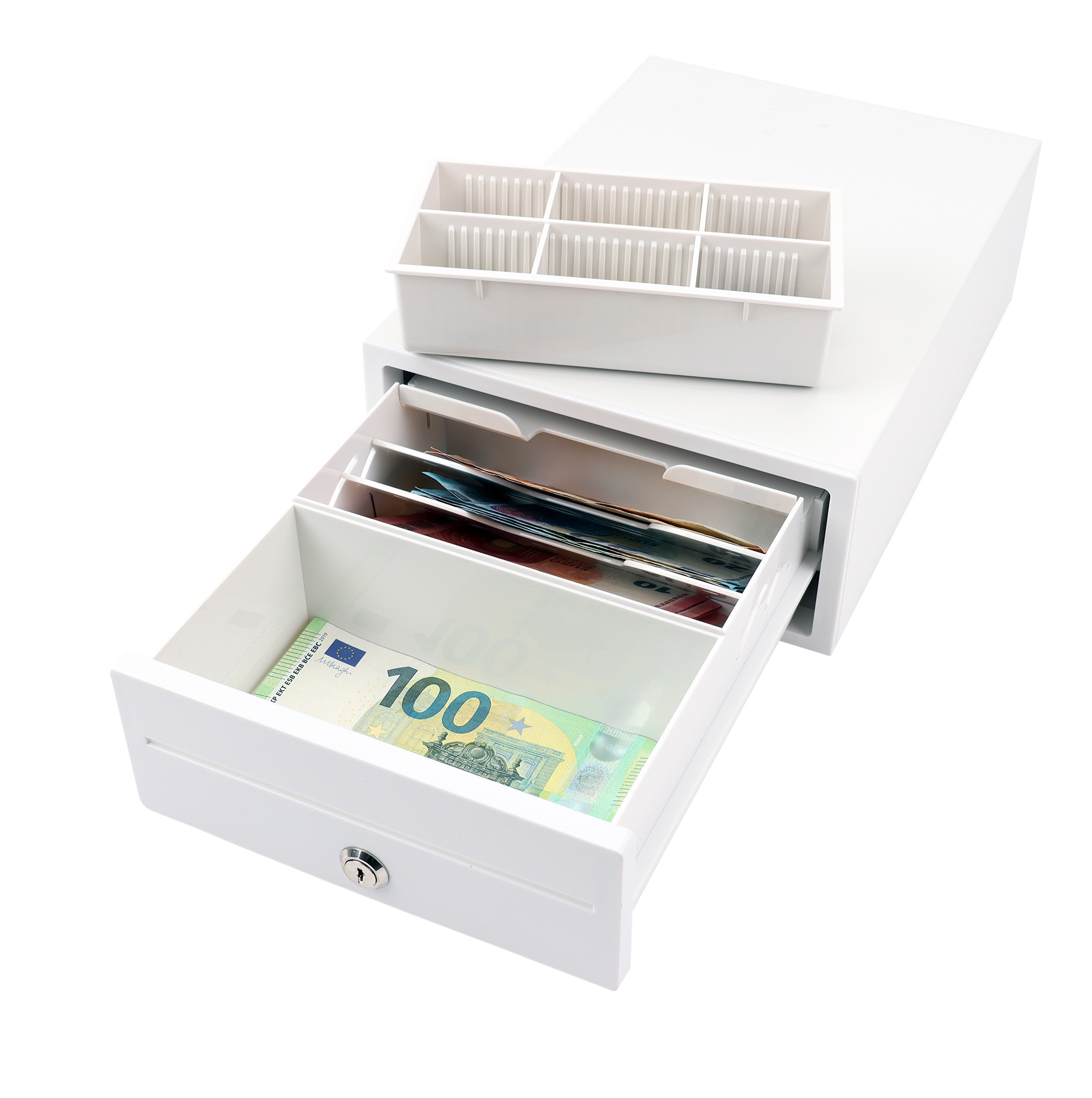 Die Kassenschublade verfügt über 8 Münz- und 4 Scheinfächer, die eine übersichtliche und sichere Aufbewahrung von Bargeld ermöglichen. Das herausnehmbare Münz- und Scheinfach erleichtert die Kassenabrechnung und sorgt für mehr Flexibilität im Arbeitsalltag. Ein integrierter Separierungsschlitz ermöglicht das Einwerfen von Belegen, Gutscheinen oder Barzahlungen, ohne die Lade öffnen zu müssen.