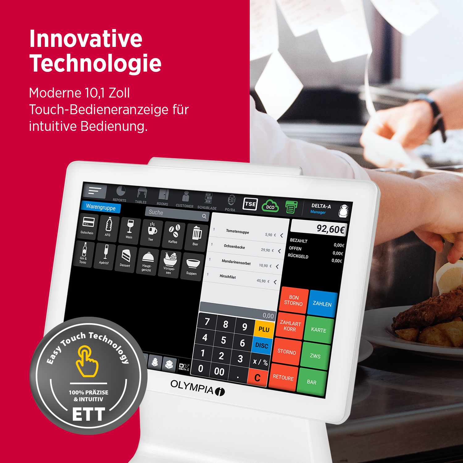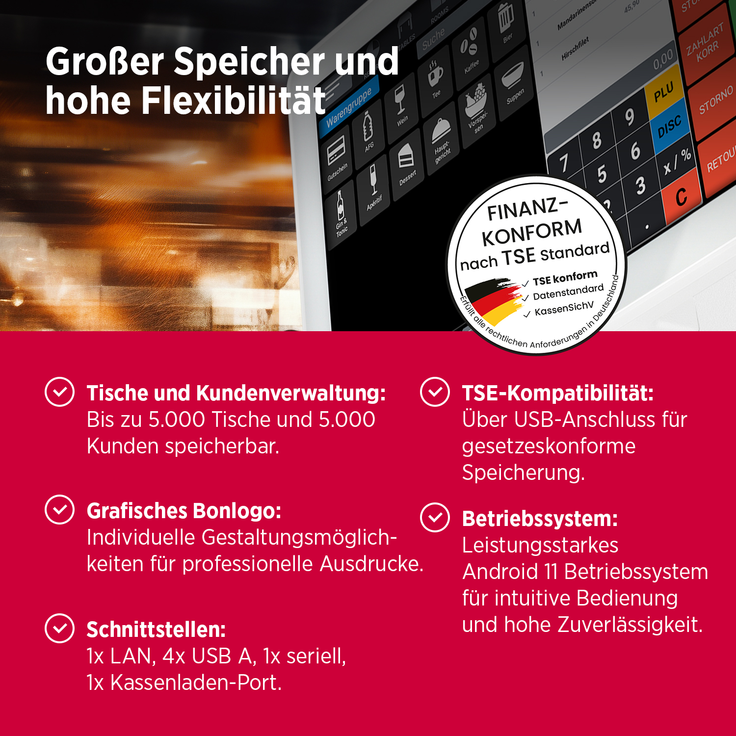 TSE-Sicherheit: USB-TSE integriert. Die TSE Lizenz muss separat erworben werden.