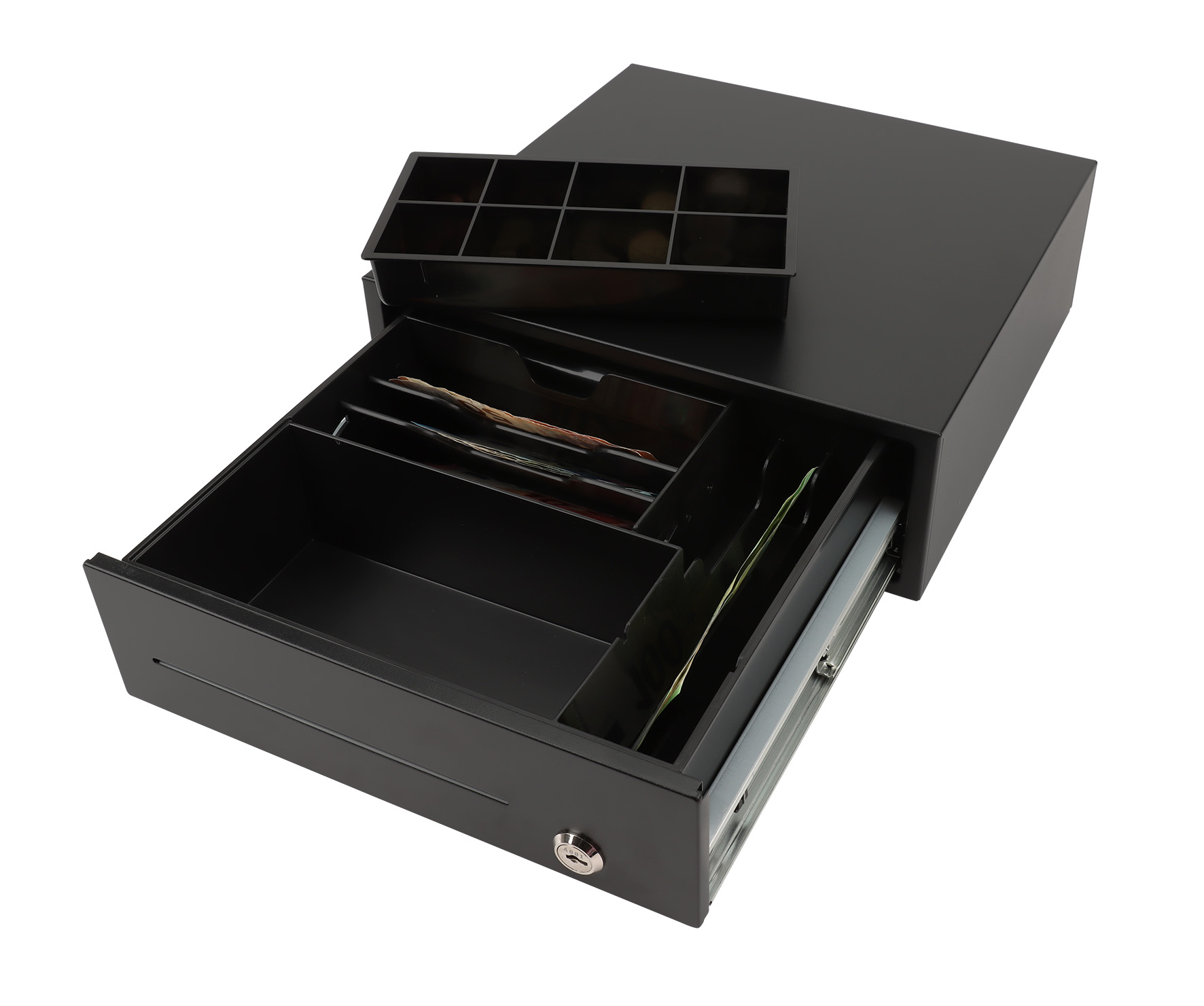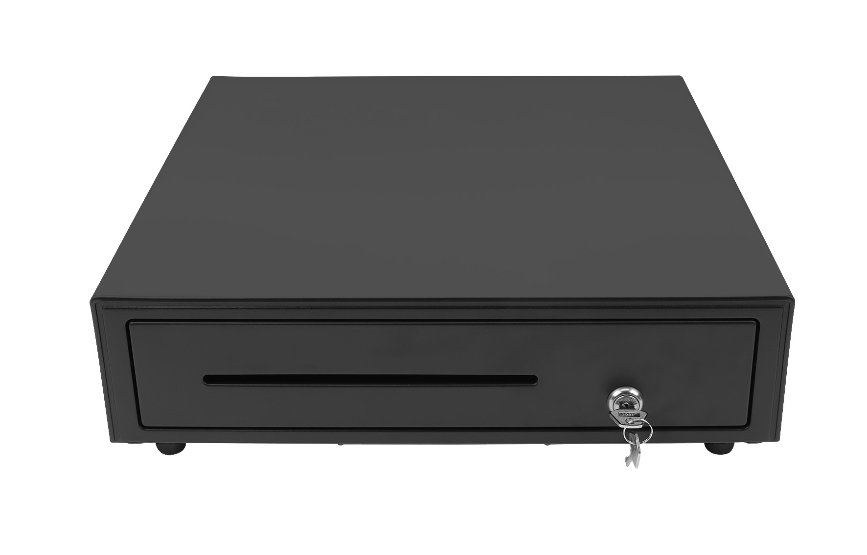 Der 12–24 V RJ12-Anschluss ermöglicht die problemlose Anbindung an gängige Kassensysteme. Zusätzlich unterstützt ein integrierter Mikroschalter die Kassenkontrolle. Für Sicherheit sorgt das stabile Schloss mit drei Schlüsselpositionen (verschlossen, in Betrieb, geöffnet), das mit zwei Schlüsseln geliefert wird.