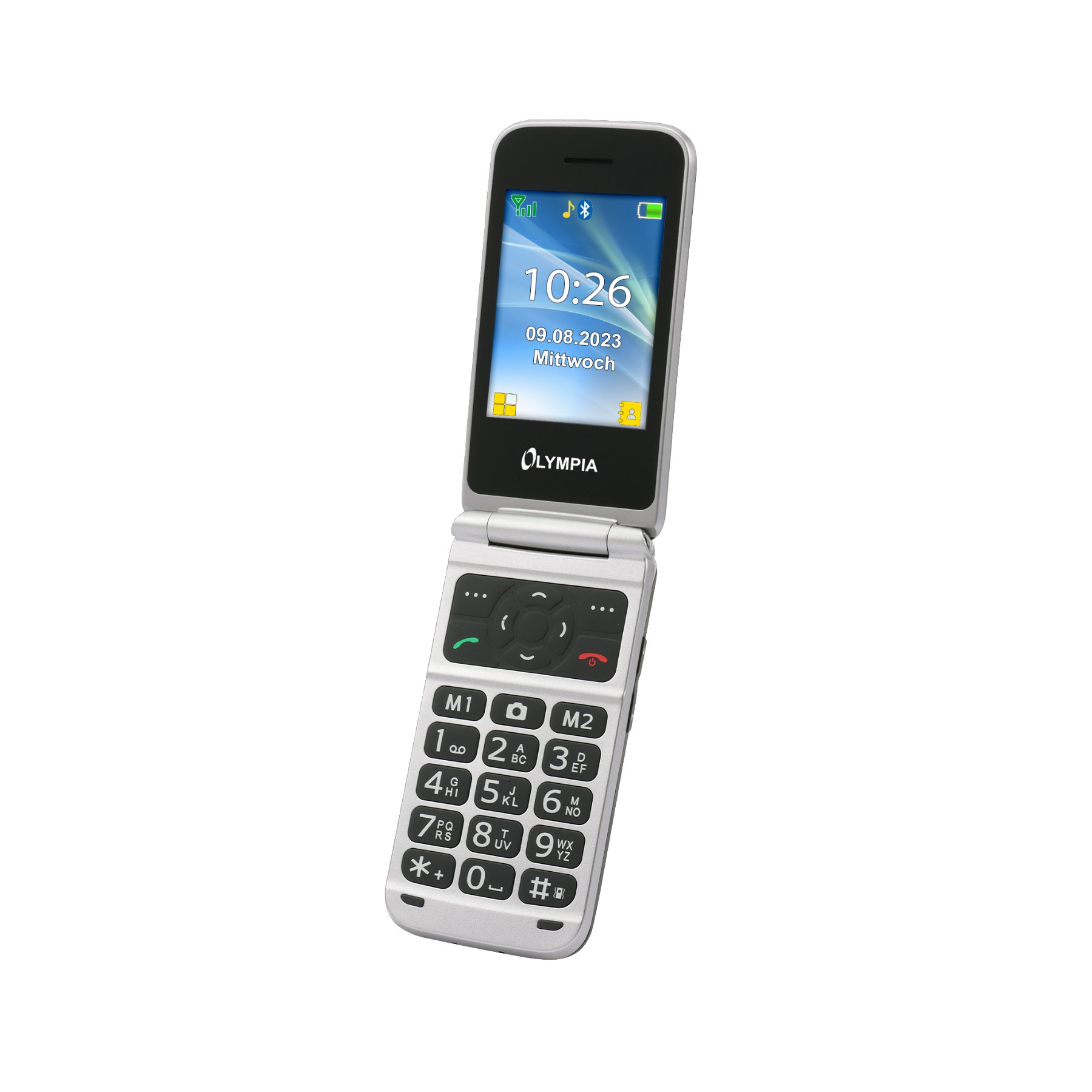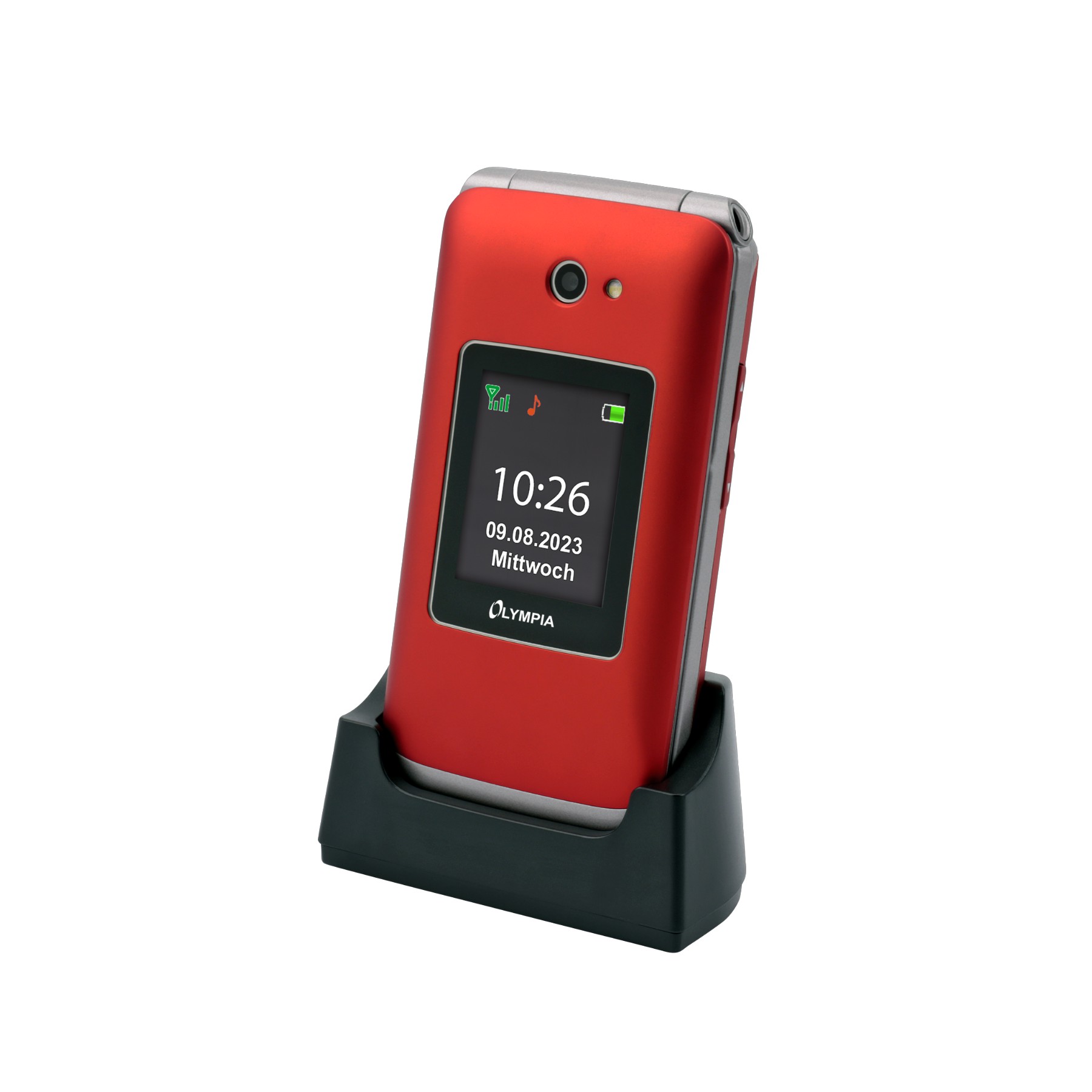 Die zwei Farbdisplays (2,8" innen und 1,77" außen) sorgen für eine klare Anzeige von Anrufen, Nachrichten und Uhrzeit. Große Symbolfelder erleichtern die Navigation durch das Menü zusätzlich.