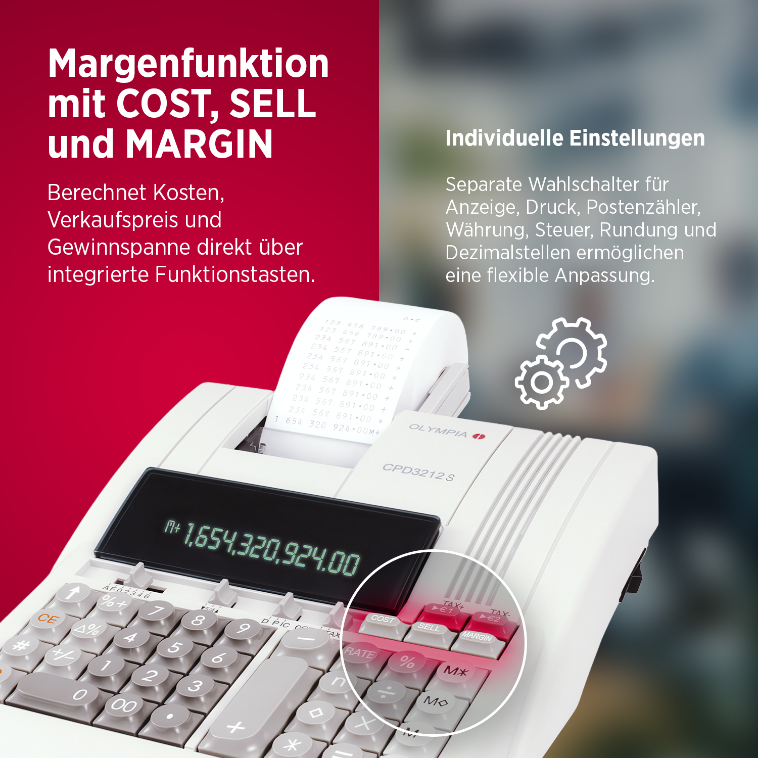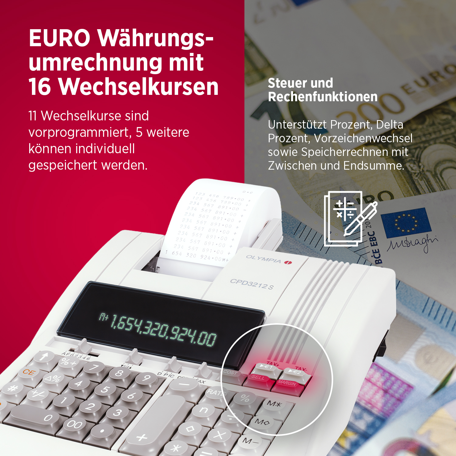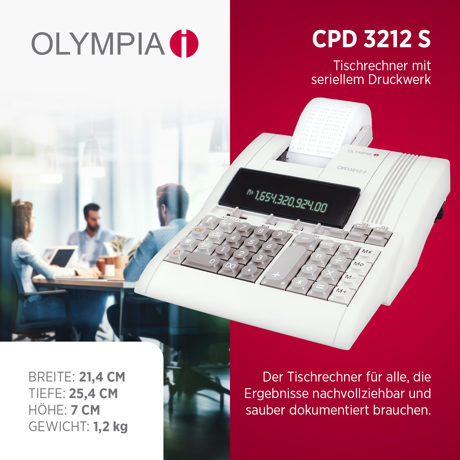- Der OLYMPIA CPD 3212 S ist ein leistungsstarker taschenrechner mit papierrolle, der speziell für den professionellen Einsatz im Büro, Handel oder in der Buchhaltung entwickelt wurde. Mit seinem seriellen Druckwerk und einer Druckgeschwindigkeit von 3 Zeilen pro Sekunde liefert er schnelle und übersichtliche Ausdrucke in Schwarz und Rot – ideal für klare Nachvollziehbarkeit von Ergebnissen.