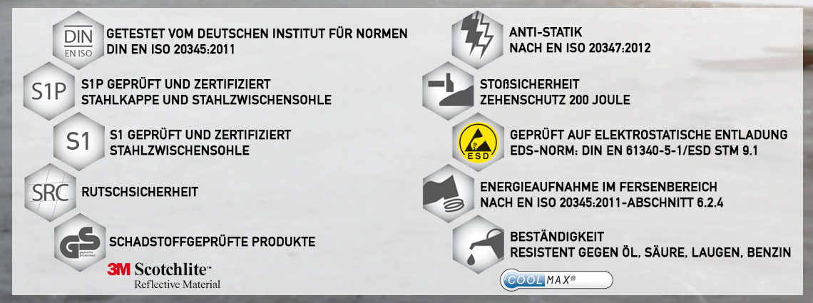 Die fast nahtlose Verarbeitung sorgt für ein druckfreies, angenehmes Tragegefühl. Das Mesh-Innenfutter, sowie die weich gepolsterte Zunge sorgen mit klimaregulierenden Eigenschaften für einen erstklassigen Tragekomfort. Der 3M-Scotchlite™-Reflektor im Fersenbereich sorgt mit hohem Reflektionsgrad für mehr Sicherheit. Die rutschhemmende und abriebfeste PU-Laufsohle besitzt beste Dämpfungseigenschaften und ist ölbeständig und kraftstoffresistent. Aufgrund seiner Verarbeitung mit synthetischen Materialien ist er auch für Chrom-Allergiker prädestiniert.