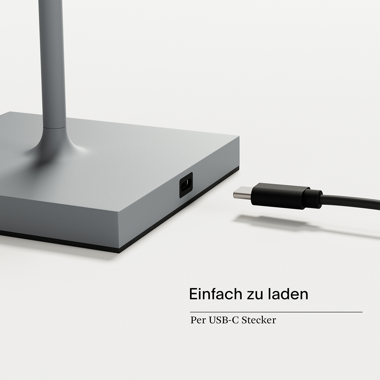 - **Weitere Merkmale:** Die Tischleuchte wird inklusive 1,2 Meter USB-C Ladekabel und Netzteil geliefert. Sie hat eine Produktbreite von 100 mm, eine Produkthöhe von 380 mm und ein Produktgewicht von 1020 g.